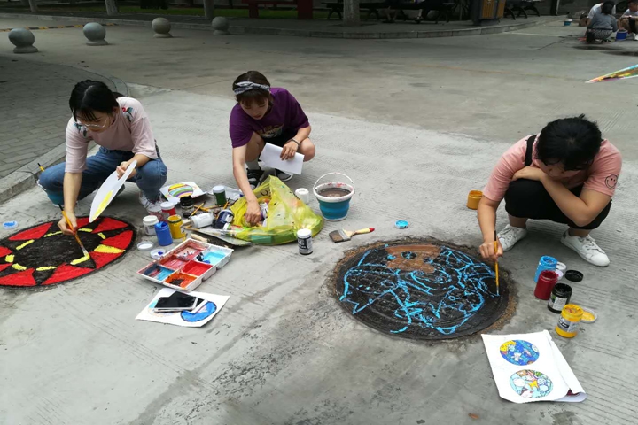 近日,在我校北校区校园里多了一道亮丽的风景线,一群提着颜料桶,手握画笔和调色盘的同学,三三两两或蹲在一起,或坐在地上,认真地画着什么。飞舞的画笔下,地面上的形象逐渐显现出来……这是同学们正在进行“井上添画”井盖涂鸦创作。