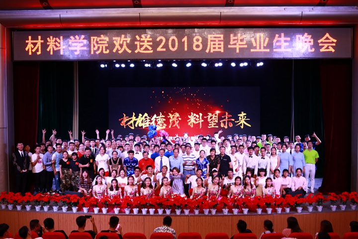 材雄德茂,料望未来。6月9日晚,材料学院欢送2018届毕业生晚会在小礼堂举办。该院全体负责人及近800名师生共同观看了此次晚会 。
