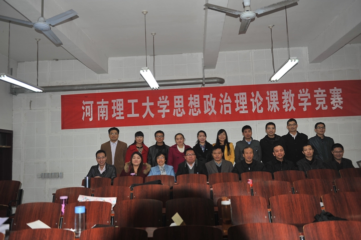 为贯彻落实《河南理工大学关于进一步加强思想政治理论课教学工作的意见》,11月22日上午,河南理工大学2014年思想政治理论课教师教学竞赛在文综楼111教室举行。本次活动经过学校思想政治理论课教学工作领导小组精心策划和统一布署,各有关单位积极协调、紧密配合,由马克思主义学院具体承办。