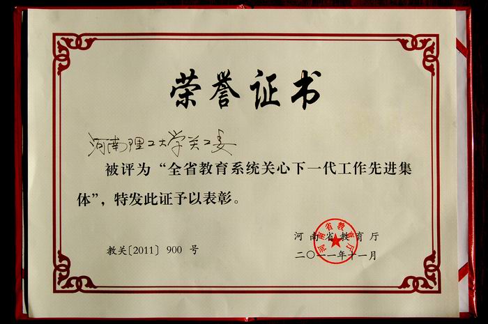 日前,在“纪念全省教育系统关工委成立20周年暨先进集体、先进个人表彰大会”上,我校关工委被河南省教育厅授予“河南省教育系统关心下一代工作先进集体”荣誉称号;苗建勃同志荣获“河南省关心下一代工作先进工作者”,王怡录、郑树森、杨雁举同志荣获“全省教育系统关心下一代工作先进工作者”荣誉。