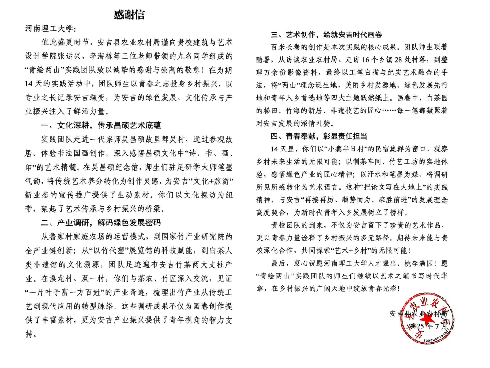 本网讯(通讯员 史新慧)近日,安吉县农业农村局向学校发来感谢信,对建艺学院张运兴、李海栋老师带领的“青绘两山”实践团队在“两山”理念诞生地开展的“三下乡”社会实践活动给予表扬。