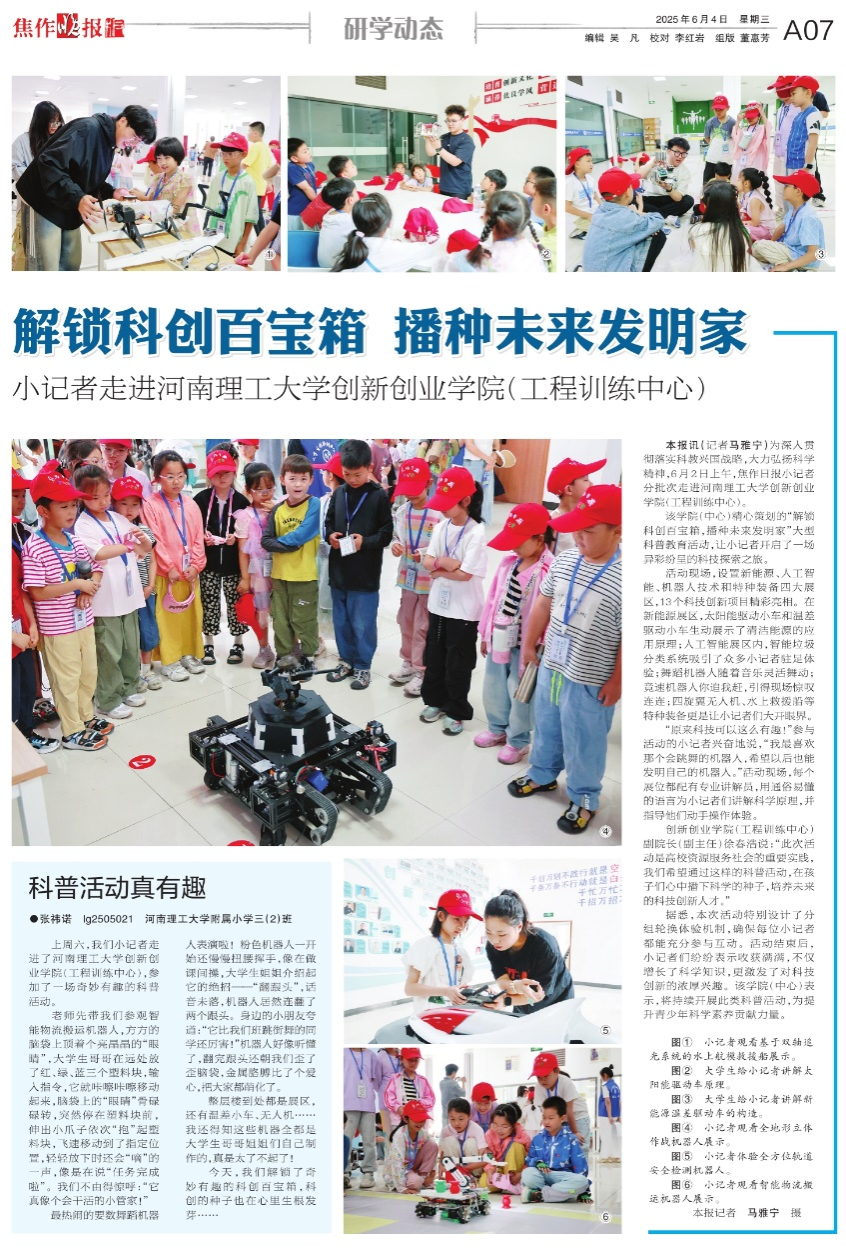 本报讯(通讯员 马雅宁)为深入贯彻落实科教兴国战略,大力弘扬科学精神,6月2日上午,焦作日报小记者分批次走进创新创业学院(工程训练中心)。该学院(中心)精心策划的“解锁科创百宝箱,播种未来发明家”大型科普教育活动,让小记者开启了一场异彩纷呈的科技探索之旅。