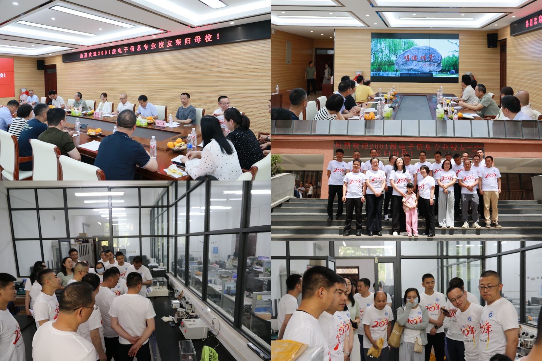 会议伊始,该院院长李明介绍了该院近年来取得的办学成就,深情回忆了校友们在校期间的点滴;原任课教师、副院长李辉、校友崔富义分别作代表发言。座谈中,电子信息工程专业2001级校友逐一汇报了个人情况,表达了对母校和老师培养的感激之情,送上了对母校和老师的美好祝福;原辅导员、校工会副主席欧阳文峰展示“百宝箱”——2001级电子信息工程专业在读期间老照片、点名册等,打开校友记忆的扉页,串联起电子信息工程2001级校友永不散场的青春……,座谈会上师生还共同观看了学校宣传片和学院宣传片,见证了母校从2001年的5栋楼到如今楼宇成群、绿树成荫,以及教学科研事业蓬勃发展的奋进历程。
