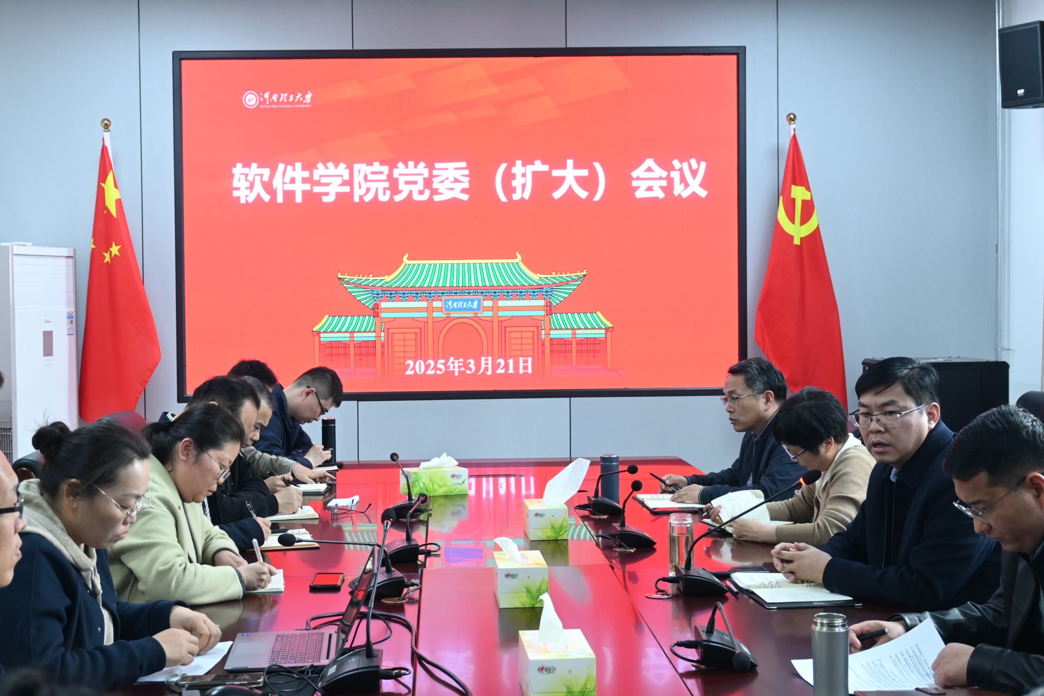 3月21日上午,计算机学院于217会议室召开党委(扩大)会议,对该院深入贯彻中央八项规定精神学习教育作出安排部署。会议由该院党委书记许辉主持,该院领导班子成员,以及师生党支部书记参加了此次会议。