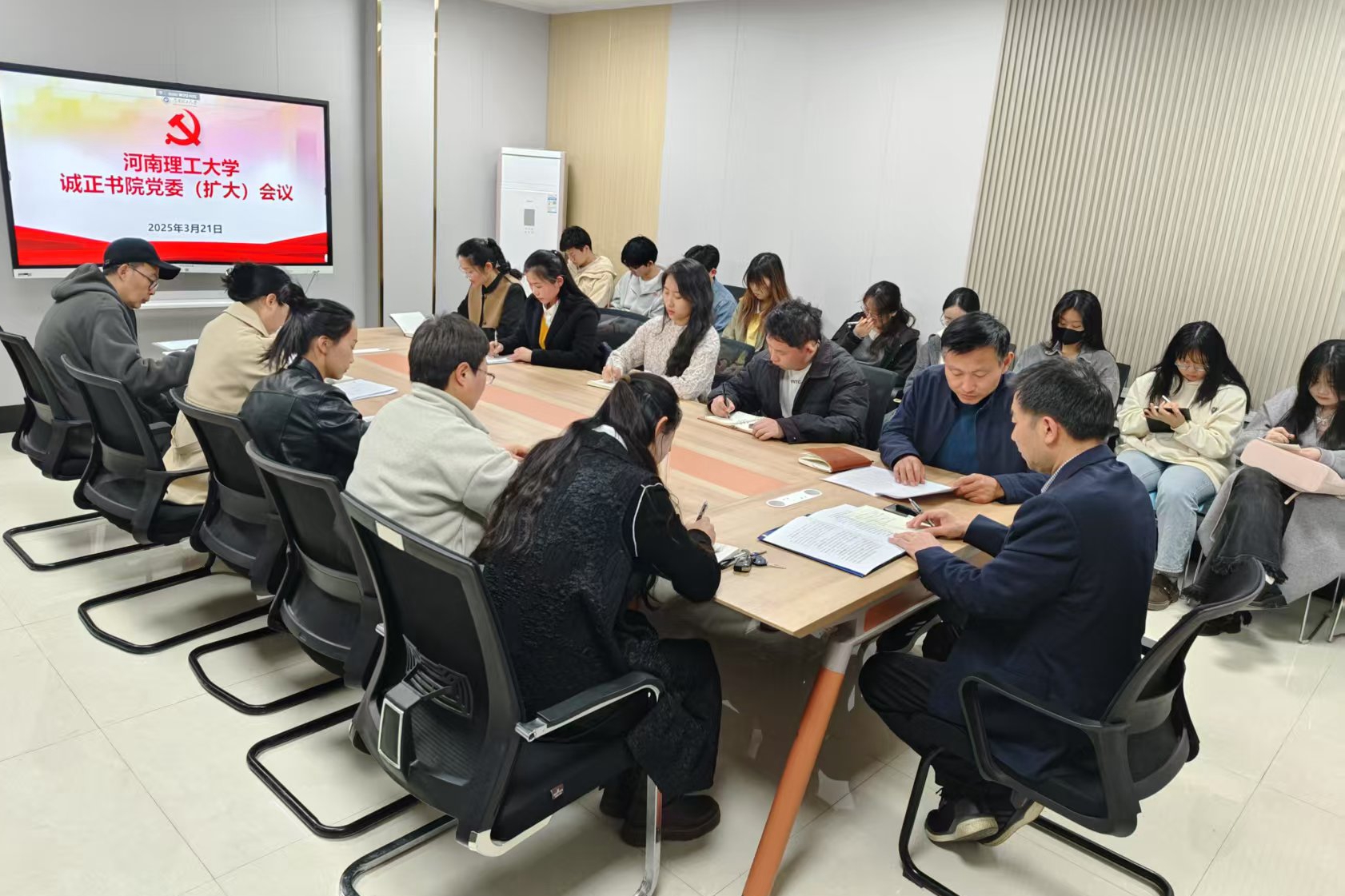 3月21日中午,诚正书院在正心会议室召开党委扩大会议,书院党委委员、全体教师党员及学生党员参会。会议由党委书记、院长孙彦主持。会上,孙彦传达了3月19日学校党委扩大会议精神,对书院深入贯彻中央八项规定精神学习教育进行了部署。