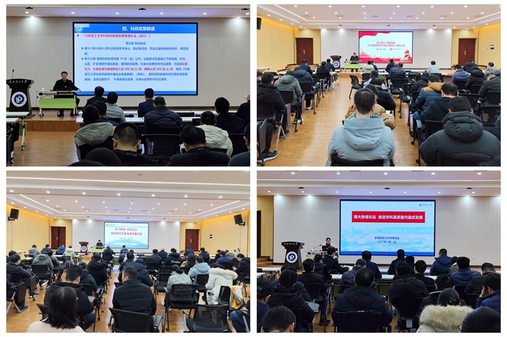 1月13日,科技处处长陈向军作了题为《开展有组织科研,助力学校高质量发展》的报告。陈处长回顾了2024年我校国家自然科学基金情况,重点解读了《河南理工大学横向科研项目经费管理办法(修订)》修编要点、河南省科学技术奖申报要点等。研究生院院长陈俊杰作了题为《学习贯彻<学位法>-推进研究生分类培养,建设教育强国》的报告。主要讲述了我国学位与研究生教育的特征、面临的机遇与挑战。1月14日,资环学院郑德顺教授作了题为《识见通达,启智润心-通识课程建设思考与实践》的报告。郑教授从历史的识见通达、自由完人过渡到当今的科技人才、教育初心,把理论与实践相结合,进行了一场图文并茂、翔实丰富的课程思政主题报告。统战部部长杨玉海以《宗教政策与意识形态专题报告》为题,就我国统一战线的地位、高校统战工作五大职责和如何开展好高校统一战线工作进行了详实讲解。