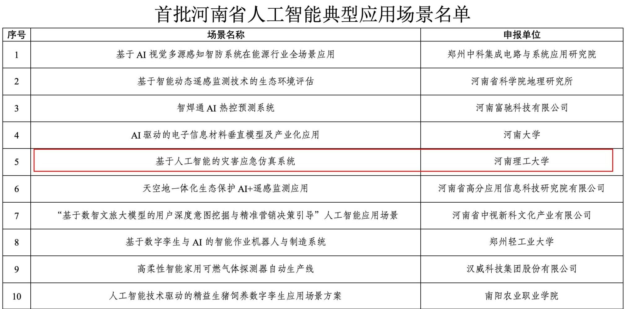 本网讯(通讯员 任建吉)近日,省发改委发布首批河南省人工智能行业赋能中心及人工智能典型应用场景名单。其中“首批河南省人工智能典型应用场景”共立项53项,我校申报的“基于人工智能的灾害应急仿真系统”获批。