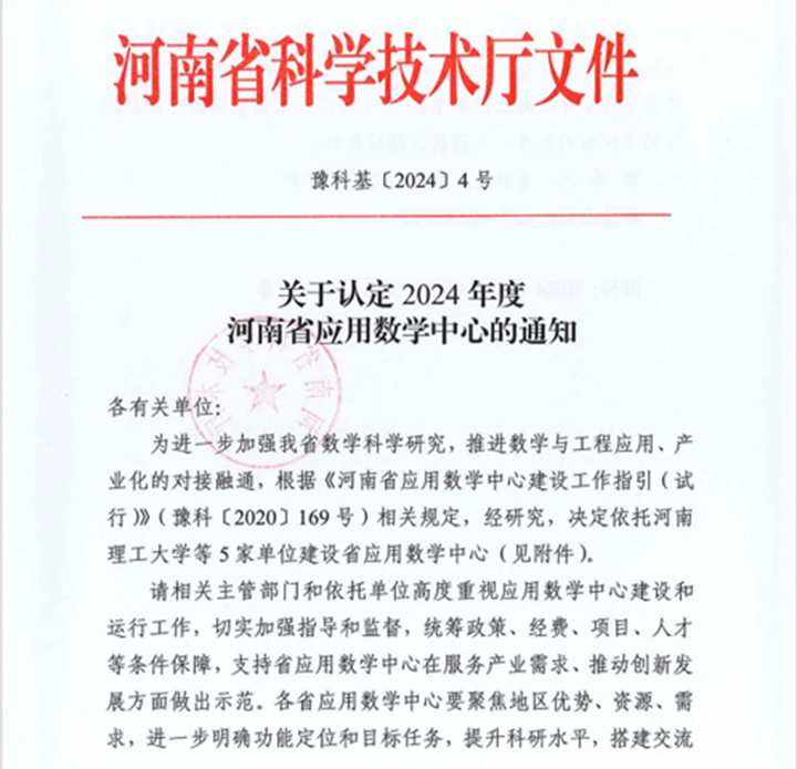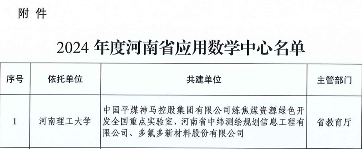 本网讯近日,河南省科技厅下发《关于认定2024年度河南省应用数学中心的通知》(豫科基〔2024〕4号),由我校牵头,中国平煤神马控股集团有限公司炼焦煤资源绿色开发全国重点实验室、河南省中纬测绘规划信息工程有限公司、多氟多新材料股份有限公司等单位共建的河南省应用数学中心入选建设名单,这是我校数学学科获批的重要省级科研平台。