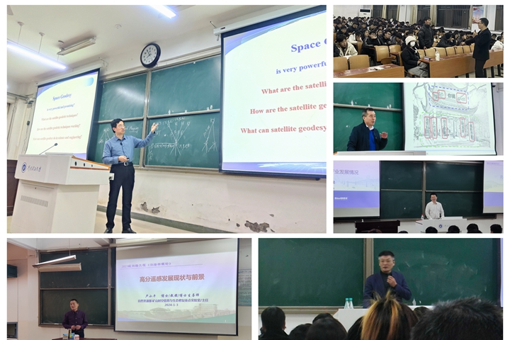 金双根从“测绘”外文名称由来及发展历程讲起,细致讲述了GNSS、北斗、InSAR、卫星重力等前沿空间大地测量技术的原理及方法,以图文并茂的形式为学生们讲述了空间大地测量手段在诸多领域的应用。段亚龙以《北斗卫星导航产业发展情况》为题,讲解了北斗卫星导航产业发展状况,介绍了在全球迫切需要高质量时空信息保障的背景下,测绘相关技术的运用环境与前景,分享了其在所参与的工程项目中的收获与经验。袁占良以《地理信息系统》为题,围绕三个关于“GIS方面”的问题进行了深度剖析,回顾了地理信息系统的概念,讲解了地理信息系统的关键技术应用和前沿技术发展,阐述了以数据获取,数据分析,数据重现三方面环节为核心的GIS技术的发展前景及应用价值。魏峰远以《测量数据处理》为题,强调了测量平差在测绘学科中的关键地位,回顾了现代测绘学概念及研究层次,介绍了以研究数据处理最优化方法、对测量成果进行质量控制等为核心科学任务的测量误差和测量数据处理的理论和研究方法,生动阐述了测量平差的研究方式和思维,以及测量平差在众多行业的典型应用。卢小平以《高分遥感发展现状与前景》为题,细致阐述了遥感技术及其分类、发展历程和研究方向,详细介绍了我国高分辨率对地观测系统和中国全球综合地球观测系统的相关概念、目的、总体思想及研究成果。景海涛以中外历史典故为切入点,强调了学习和运用相应地理学知识的重要性,深入浅出解读了地理信息系统的基本概念,用“五W一H”阐述了地理信息系统的运用。