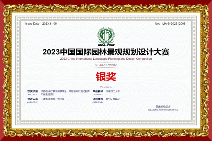 本网讯(通讯员 王孟瑾)在2023中国国际园林景观规划设计大赛中,建艺学院2019级风景园林规划专业方向的学子王孟瑾、姜萧萧、刘柏年三位同学在张运兴、李志刚老师的指导下,报送的本科组作品《凤栖梧——基于景观叙事理论,陪嫁庄村沉浸式爱情文化景观设计》喜获银奖。