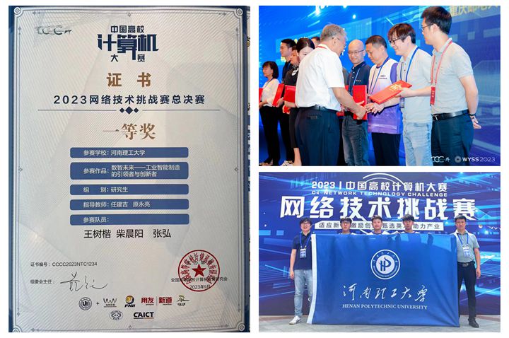 本网讯 (通讯员 任建吉)9月7日至9日,2023中国高校计算机大赛网络技术挑战赛全国总决赛在温州大学举行。经过激烈角逐,我校研究生王树楷、柴晨阳、张弘的参赛作品《数智未来——工业智能制造的引领者与创新者》获得全国总决赛一等奖,指导教师任建吉获得全国总决赛优秀指导教师奖,再创佳绩。