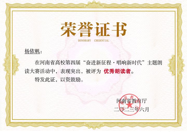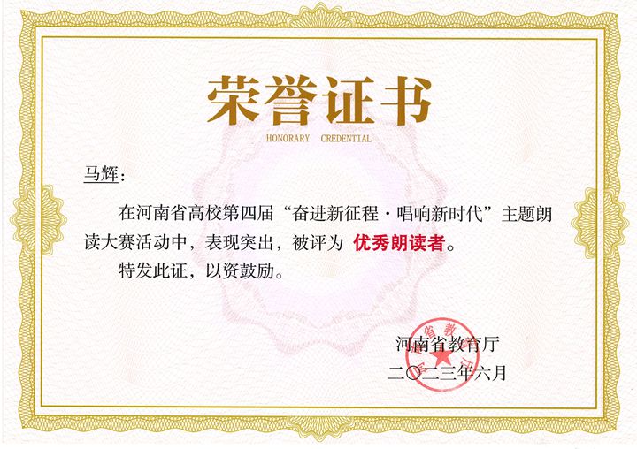本网讯 (通讯员 金建军)近日,由河南省教育厅高等教育处指导、河南省高等学校图书情报工作委员会主办的第四届河南省高校“奋进新征程·唱响新时代”主题朗读大赛获奖名单揭晓,我校师生在该赛事中喜获佳绩。马辉、梁晶、孙尚前、徐清华四位老师以及杨依帆、郭晓盼两位同学被省教育厅评为“优秀朗读者”,金建军、刘蓝蓝两位老师被河南省高校图工委评为“优秀指导老师”。