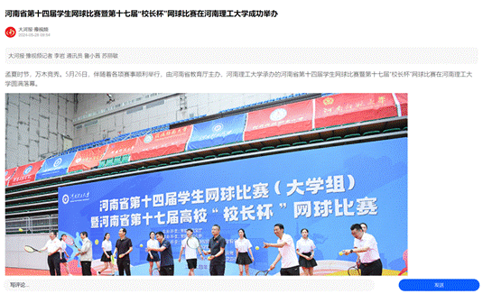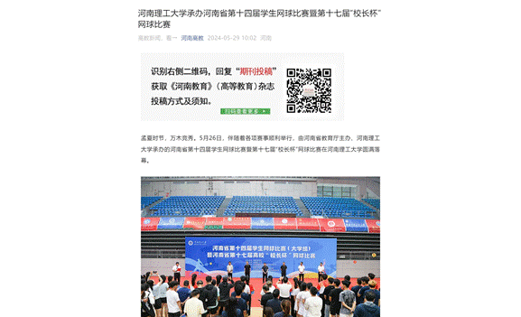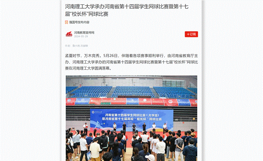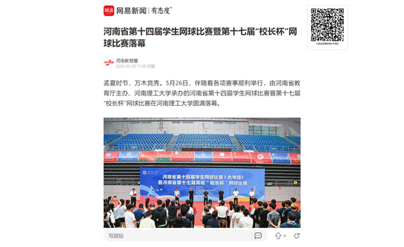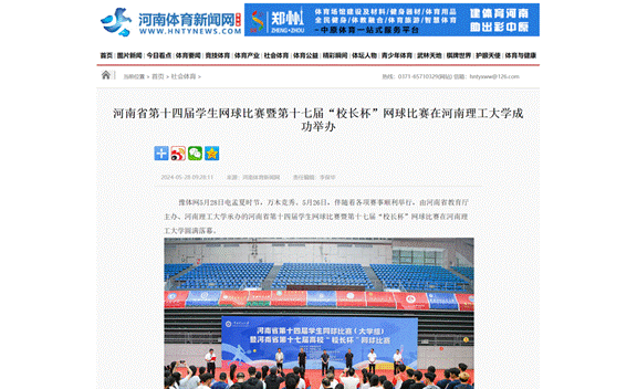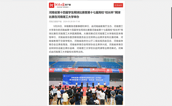 5月26日,河南省第十四届学生网球比赛暨河南省第十七届高校“校长杯”网球比赛在河南理工大学圆满落幕。连日来,河南日报客户端等媒体对此进行了报道,具体情况如下: