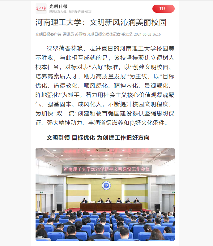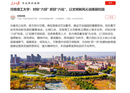 路虽远,行则将至。聚焦师生期盼、提升校园品质、涵养文明新风,在校园文明创建上下足真功实功,新时代文明实践才能落地有声。河南理工大学将坚持以习近平新时代中国特色社会主义思想为指引,聚焦立德树人根本任务,担负起新的文化使命,汇聚全校师生团结奋进的磅礴力量,以强劲的创造力、感召力、凝聚力,绘就校园文明的美好画卷,在建设社会主义文化强国、建设中华民族现代文明的奋斗实践中展现新气象新作为。