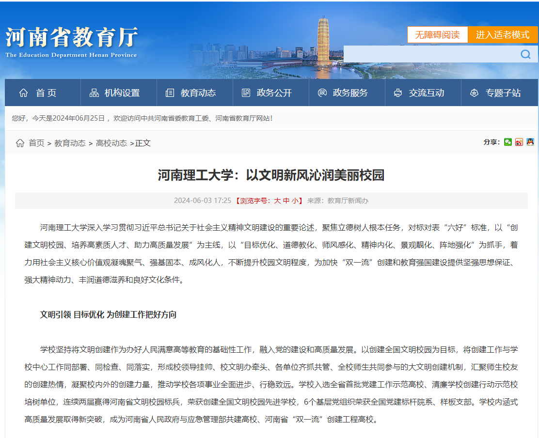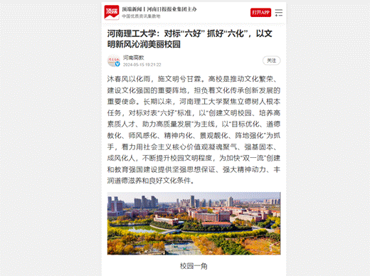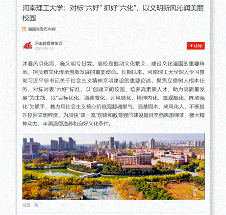 绿翠荷香花艳,走进夏日的河南理工大学校园美不胜收,与此相互成就的是,该校坚持聚焦立德树人根本任务,对标对表“六好”标准,以“创建文明校园、培养高素质人才、助力高质量发展”为主线,以“目标优化、道德教化、师风感化、精神内化、景观靓化、阵地强化”为抓手,着力用社会主义核心价值观凝魂聚气、强基固本、成风化人,不断提升校园文明程度,为加快“双一流”创建和教育强国建设提供坚强思想保证、强大精神动力、丰润道德滋养和良好文化条件。
