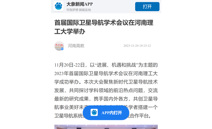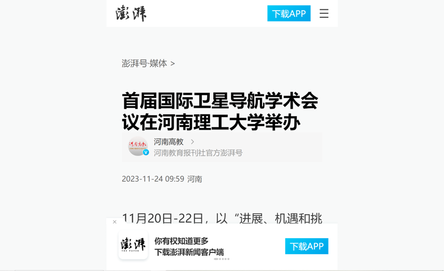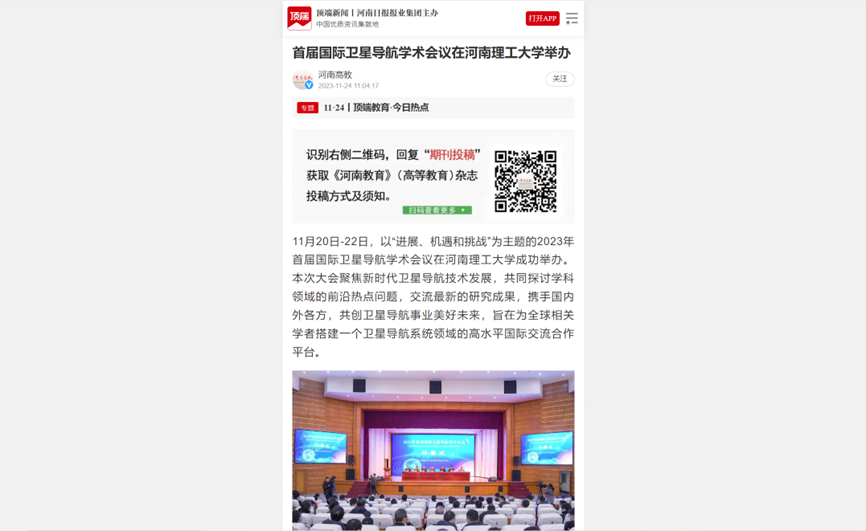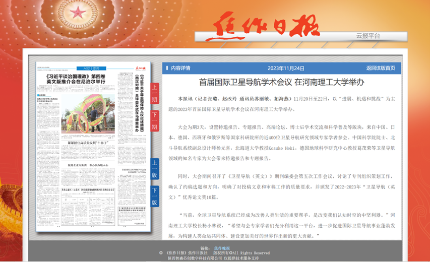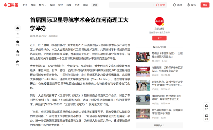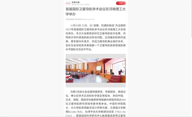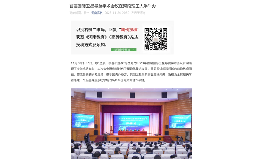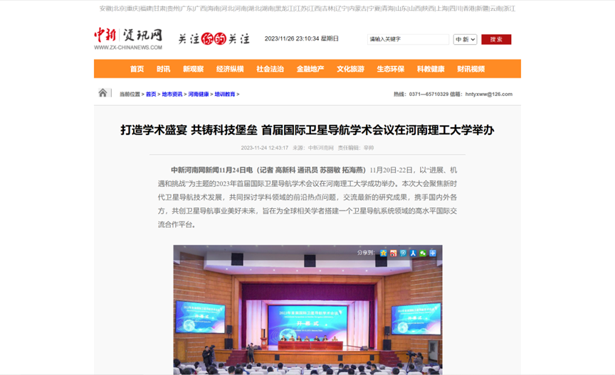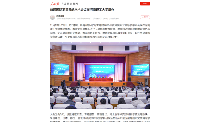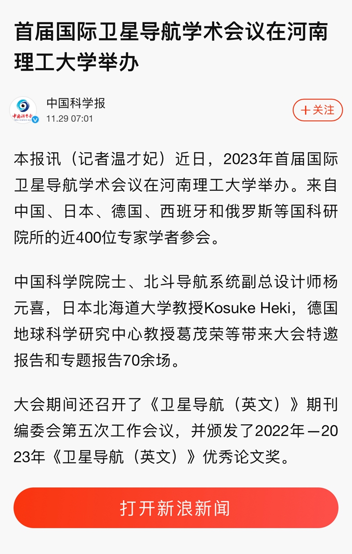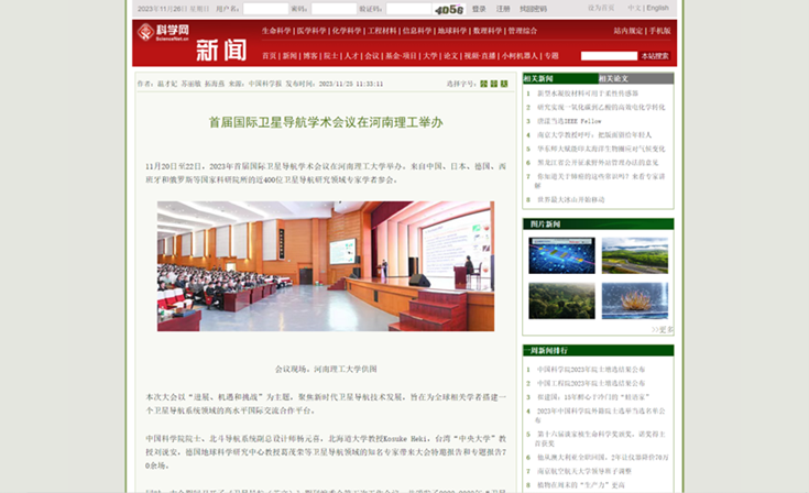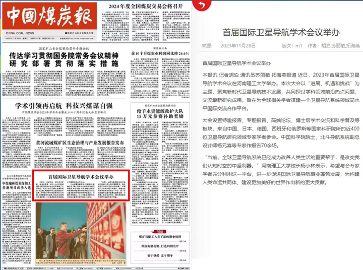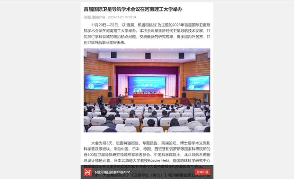 11月20日,首届国际卫星导航学术会议在河南理工大学举办。大会为期3天,来自中国、日本、德国、西班牙和俄罗斯等国家科研院所的近400位卫星导航研究领域专家学者参会。连日来,《中国科学报》、光明日报客户端、中国科学网、河南日报客户端、新浪网等媒体进行了报道,引发热烈反响,具体内容如下:
