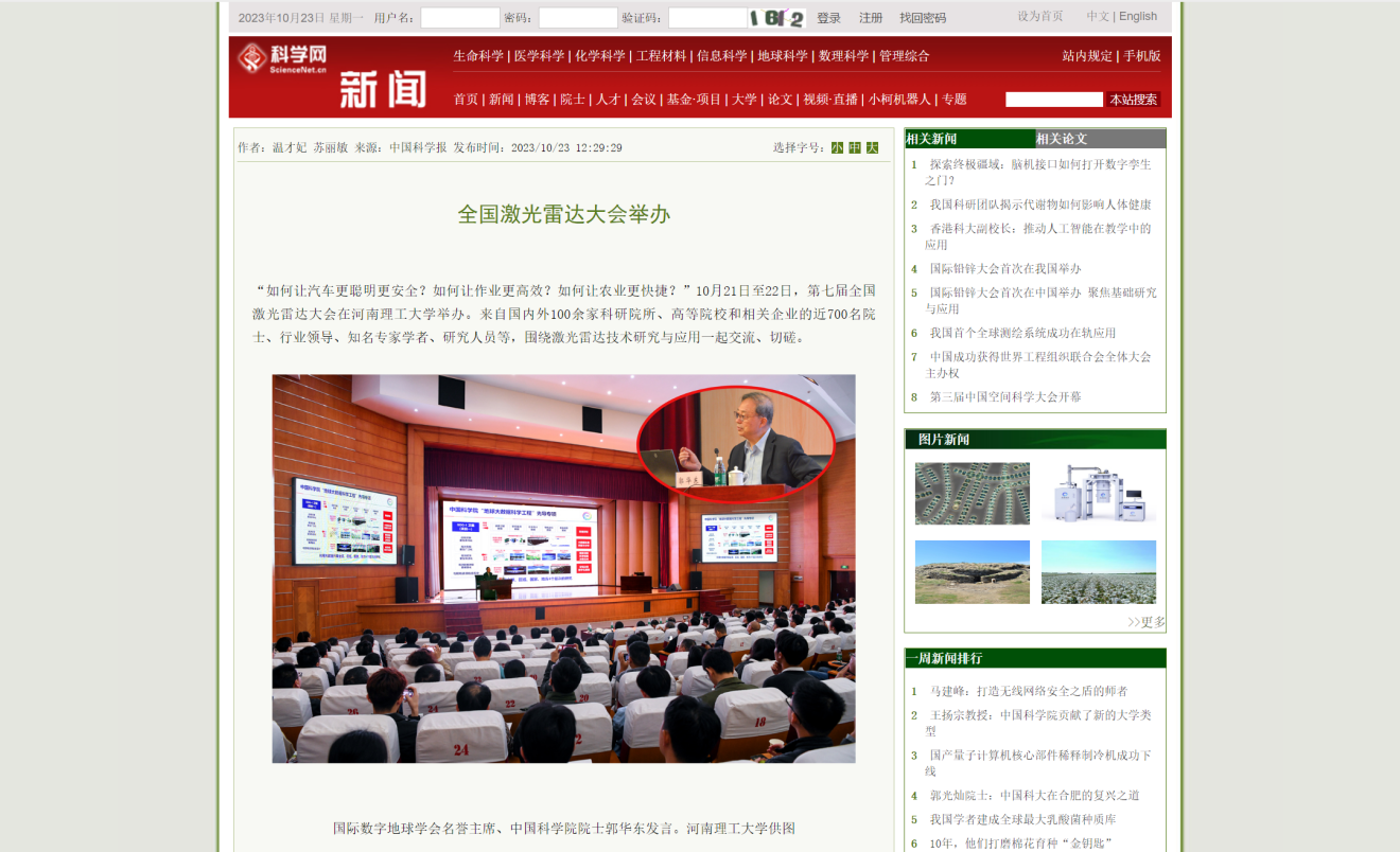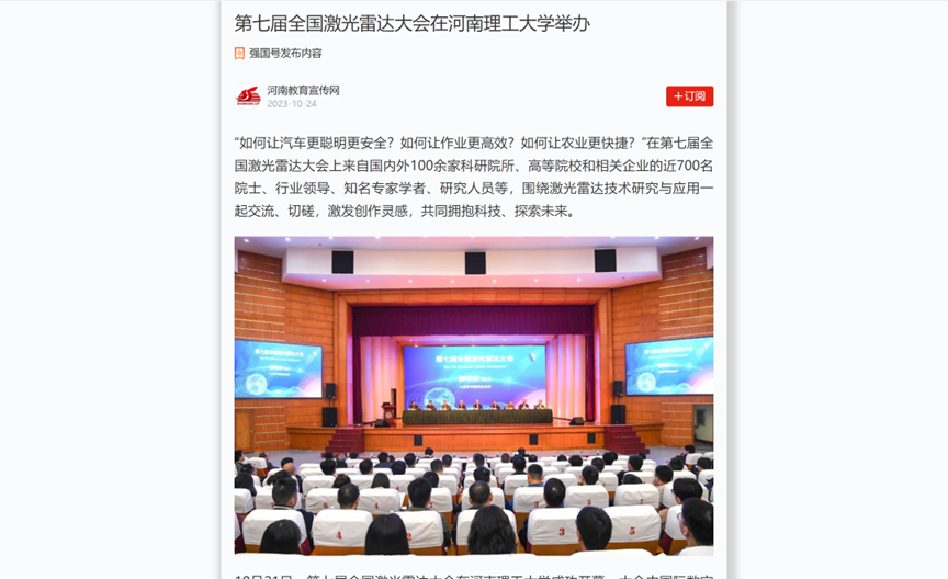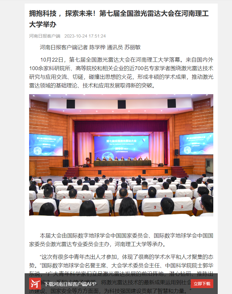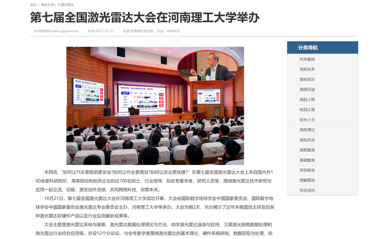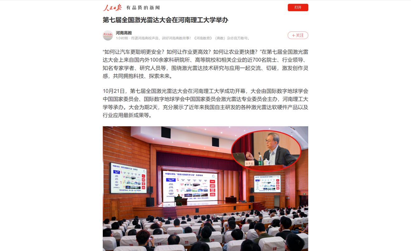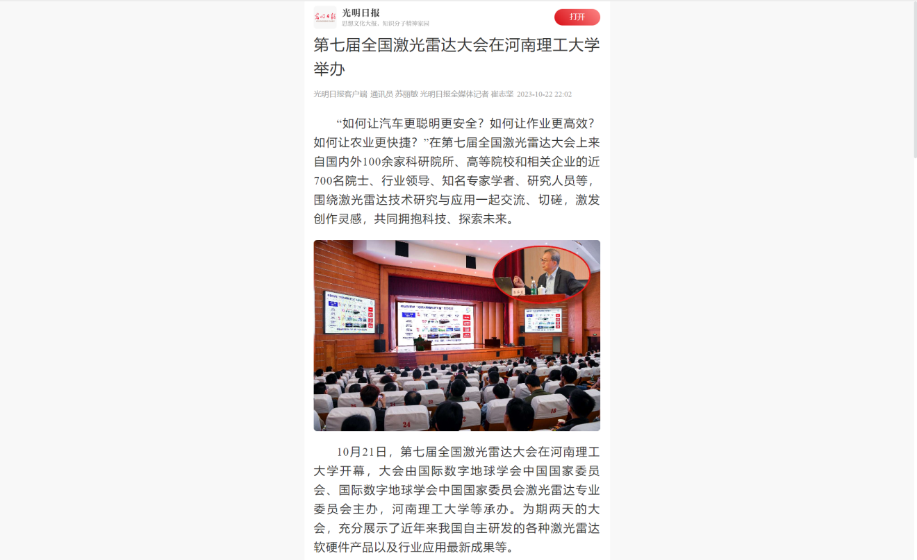 10月21日,第七届全国激光雷达大会在河南理工大学开幕,为期两天的大会,充分展示了近年来我国自主研发的各种激光雷达软硬件产品以及行业应用最新成果等。连日来,光明日报客户端、中国科学网等15家媒体进行了宣传,引发了热烈反响。具体内容如下: