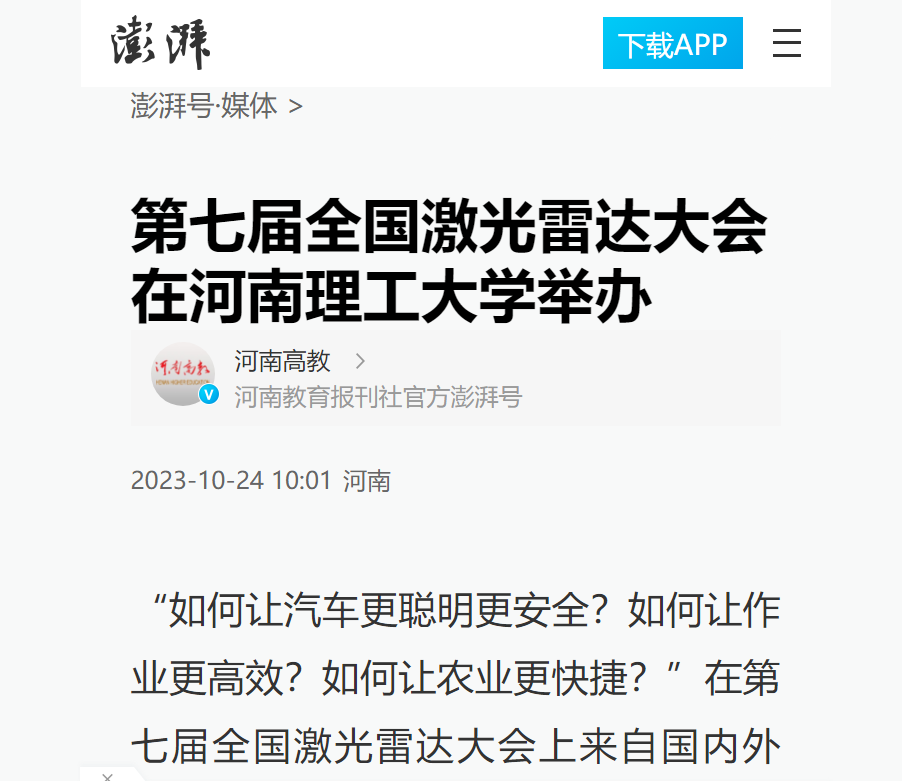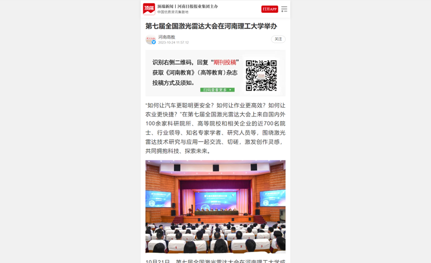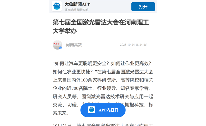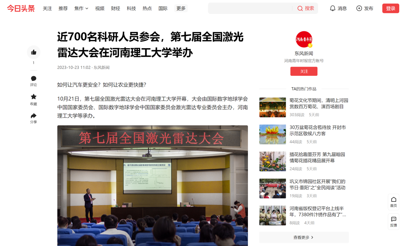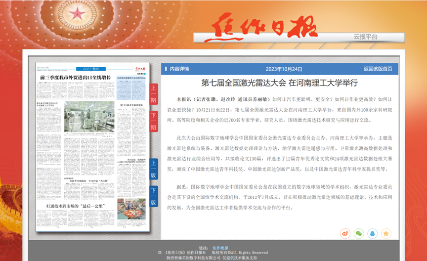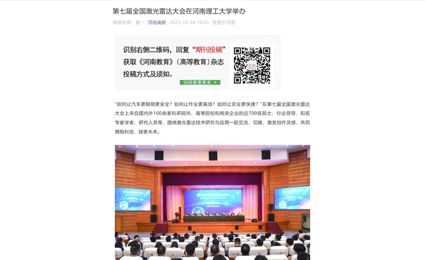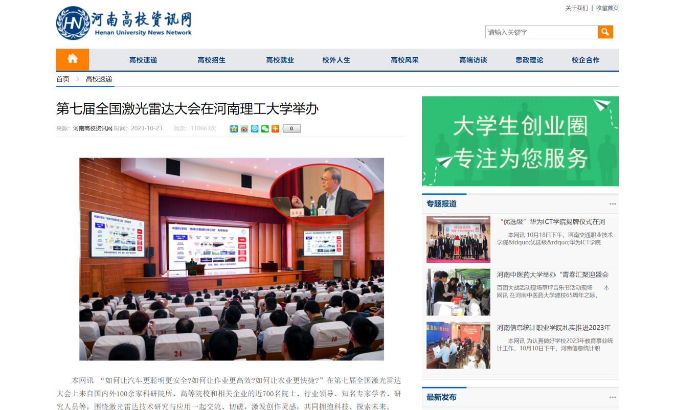 10月21日,第七届全国激光雷达大会在河南理工大学开幕,为期两天的大会,充分展示了近年来我国自主研发的各种激光雷达软硬件产品以及行业应用最新成果等。连日来,光明日报客户端、中国科学网等15家媒体进行了宣传,引发了热烈反响。具体内容如下: