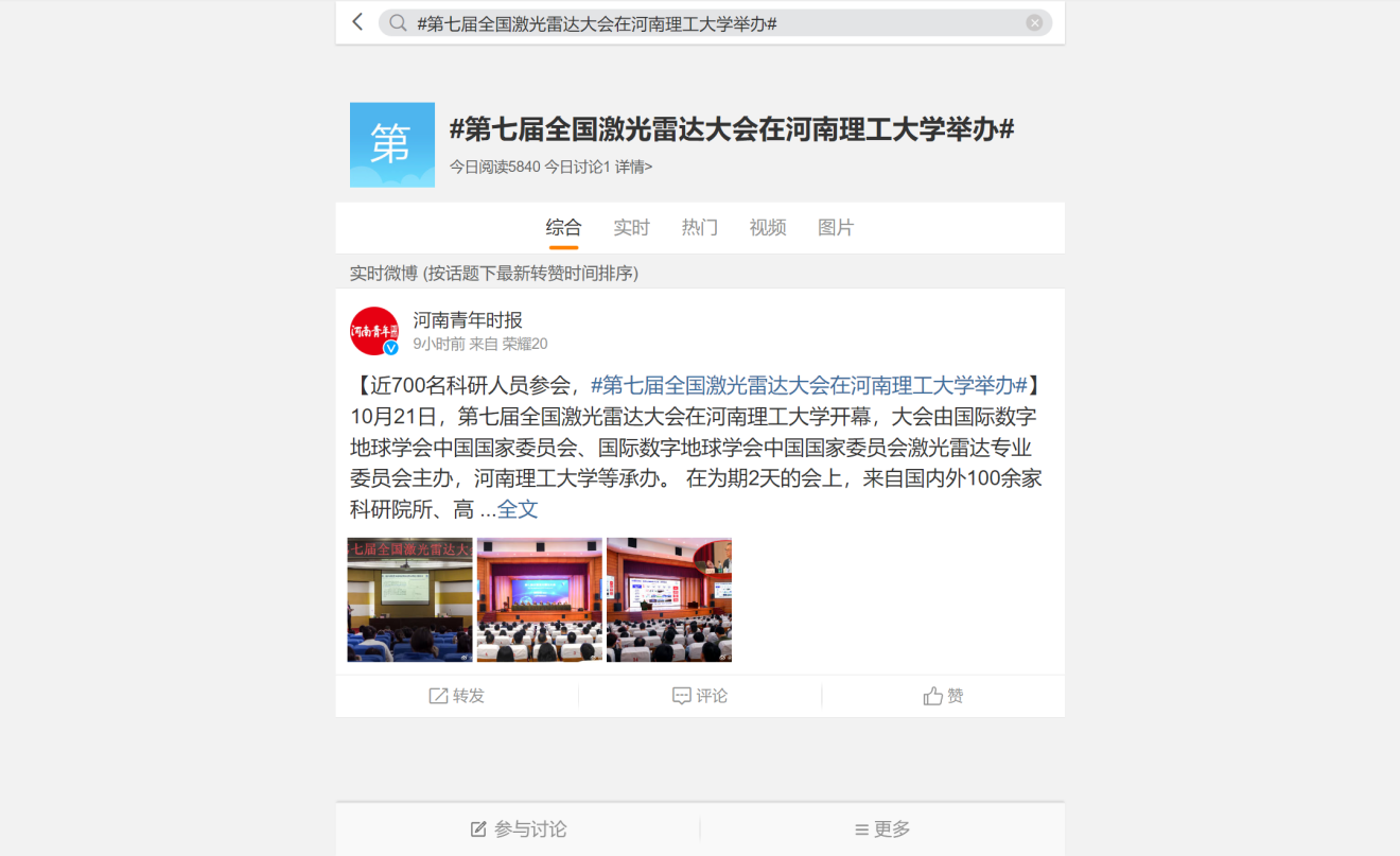 https://m.weibo.cn/search?containerid=231522type%3D1%26q%3D%23%E7%AC%AC%E4%B8%83%E5%B1%8A%E5%85%A8%E5%9B%BD%E6%BF%80%E5%85%89%E9%9B%B7%E8%BE%BE%E5%A4%A7%E4%BC%9A%E5%9C%A8%E6%B2%B3%E5%8D%97%E7%90%86%E5%B7%A5%E5%A4%A7%E5%AD%A6%E4%B8%BE%E5%8A%9E%23&luicode=10000011&lfid=231522type%3D1%26q%3D%23%E7%AC%AC%E4%B8%83%E5%B1%8A%E5%85%A8%E5%9B%BD%E6%BF%80%E5%85%89%E9%9B%B7%E8%BE%BE%E5%A4%A7%E4%BC%9A%E5%9C%A8%E6%B2%B3%E5%8D%97%E7%90%86%E5%B7%A5%E5%A4%A7%E5%AD%A6%E4%B8%BE%E5%8A%9E%23&v_p=42