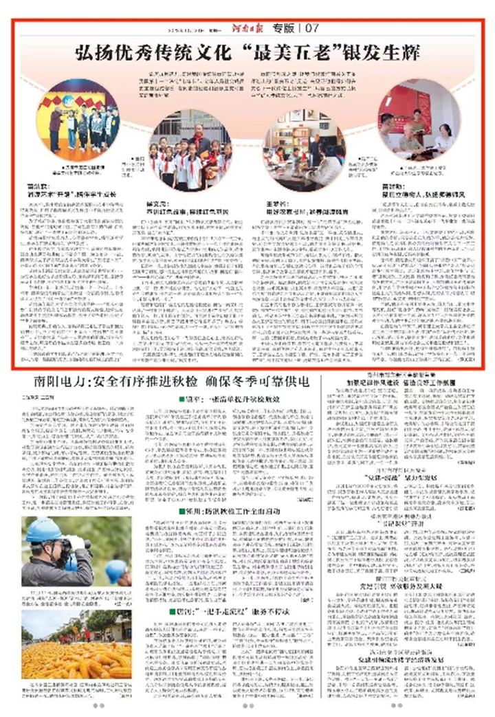 10月23日,《河南日报》第7版以《弘扬优秀传统文化“最美五老”银发生辉》为题,报道学校原党委副书记、校关工委顾问苗建勃数十年如一日冲锋在关心下一代事业第一线的相关事迹。相关内容如下: