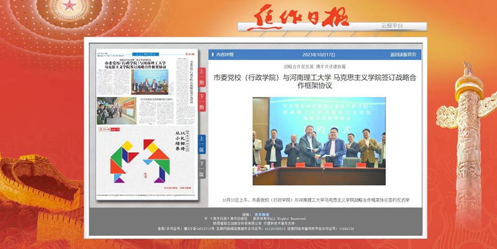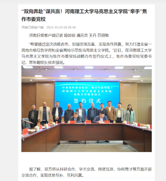 近日,在河南理工大学马克思主义学院与焦作市委党校签署战略合作,双方将从科研合作、学术交流、师资互派、协同育才等方面开展交流合作,实现优势互补、互利共赢。