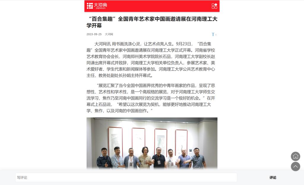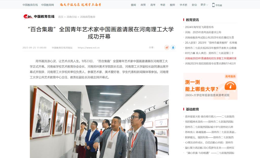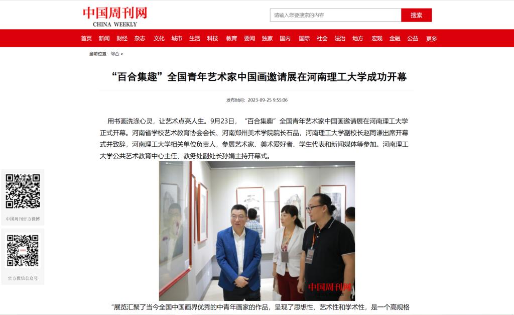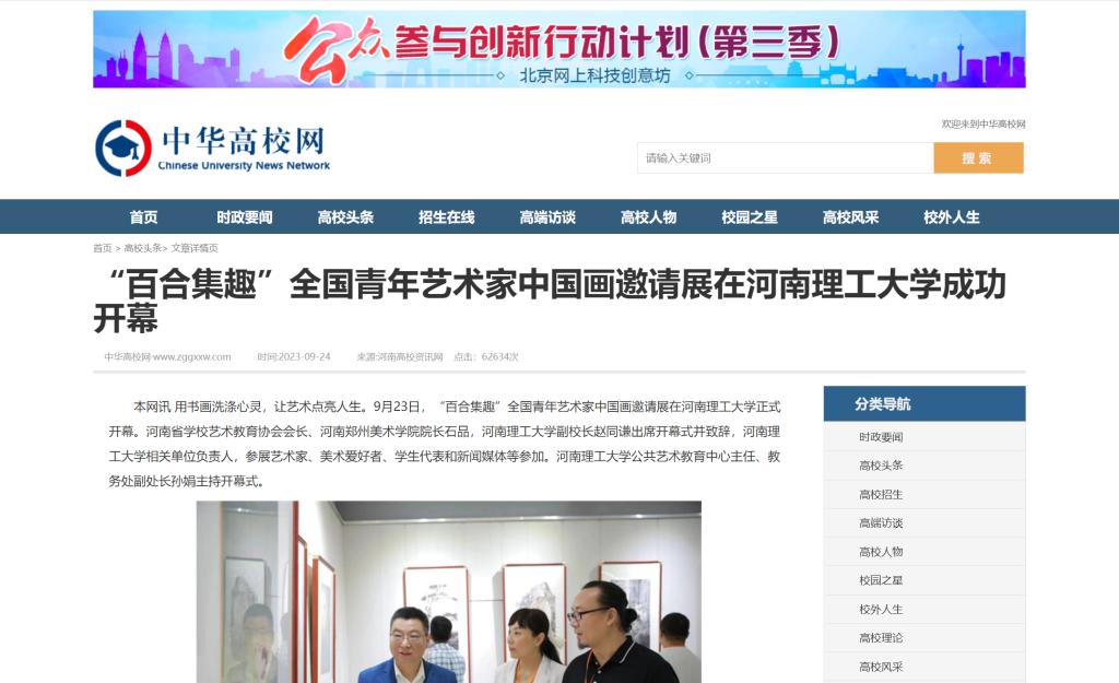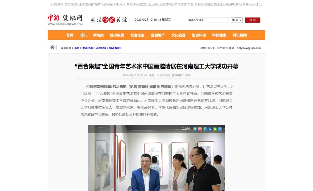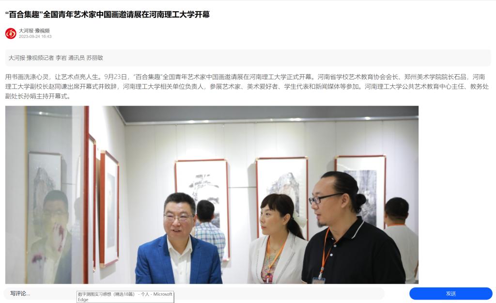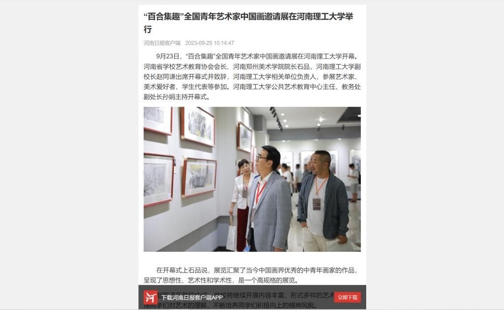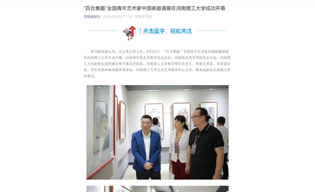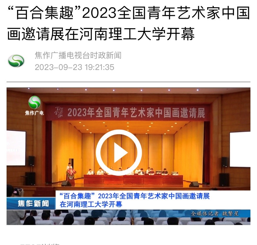 9月23日,“百合集趣”全国青年艺术家中国画邀请展在河南理工大学开幕。展览汇聚了20位优秀青年艺术家的中国画人物、山水、花鸟等近100件(幅)精美作品,既体现了当今青年艺术家的创作才华和对艺术的执着追求,又凝结着真挚的人民情怀和浓厚的爱国意识。相关文章被光明日报客户端、河南日报客户端等10余家媒体宣传报道。相关内容如下: