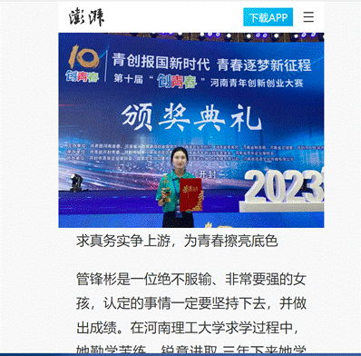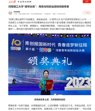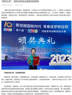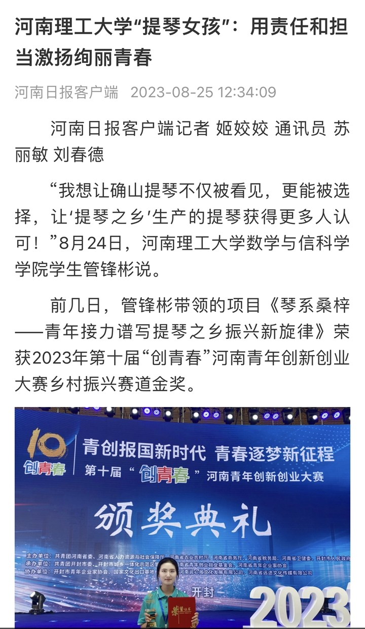 “我想让确山提琴不仅被看见,更能被选择,让‘提琴之乡’出产的提琴获得更多人认可……”河南理工大学数学与信科学学院2020级数学与应用数学专业学生管锋彬在2023年第十届“创青春”河南青年创新创业大赛颁奖典礼上说,“为了梦想,激情奋斗、顽强拼搏的青春,才能充实无悔!”她带领的项目《琴系桑梓——青年接力谱写提琴之乡振兴新旋律》获得大赛乡村振兴赛道金奖。