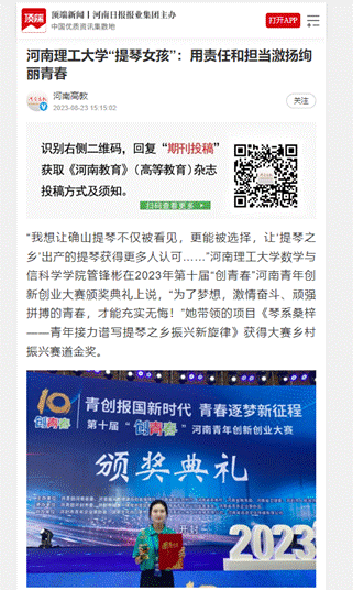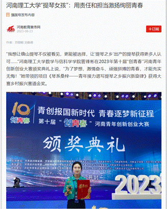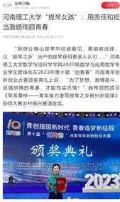 光明日报客户端2023年8月22日以《河南理工大学“提琴女孩”:用责任和担当激扬绚丽青春》为题,并配发图片,报道河南理工大学数信学院管锋彬心系桑梓,凝心聚力带动家乡发展,打造乡村振兴琴乡范本的优秀事迹。人民日报客户端、大河报、大公中原网、河南高校资讯网等10余家媒体也对此作了报道,相关内容如下: