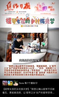 目前,团队与确山及驻马店周边38家制琴企业,49支制琴师团队已达成长期且稳定的工艺标准应用合作,通过规范化制作工艺进一步提升了制琴工坊集聚地确山县竹沟镇出品提琴的品质,并且,今年达成自有品牌系列提琴532.5万元的订购意向合同。在团队的不断努力下,她们的创业公司即将落地,致力于“政”“产”“教”“创”资源整合,探索确山提琴生产、销售、教培三位一体的本土提琴运营路径,进一步推广创业模式,助力确山提琴产业抱团发展。完善教育反哺链条,持续从高校唤回人才、留住人才,同时在家乡继续开展“拉琴、制琴、卖琴”的三维人才培养模式,不断培养人才、发展人才。双线并举,切实以人才振兴助力产业振兴,凝心聚力带动家乡发展,打造乡村振兴琴乡范本。