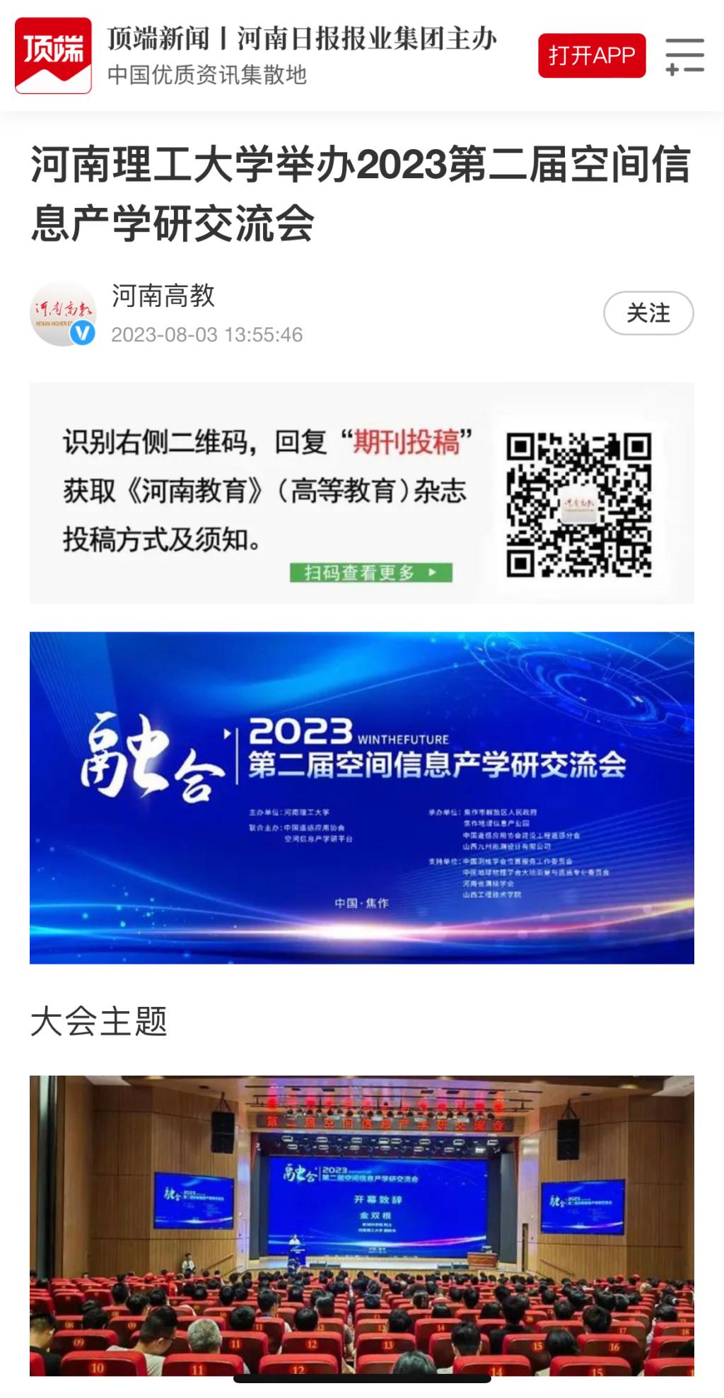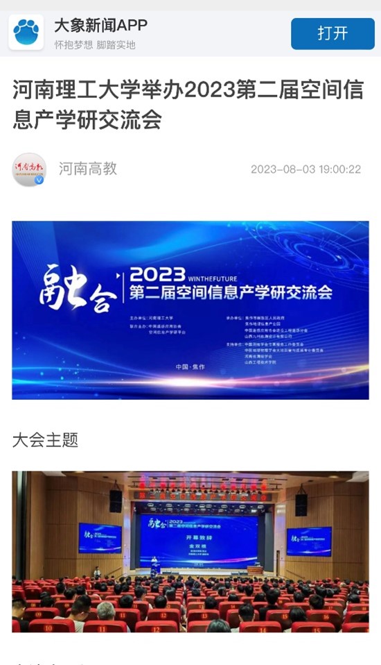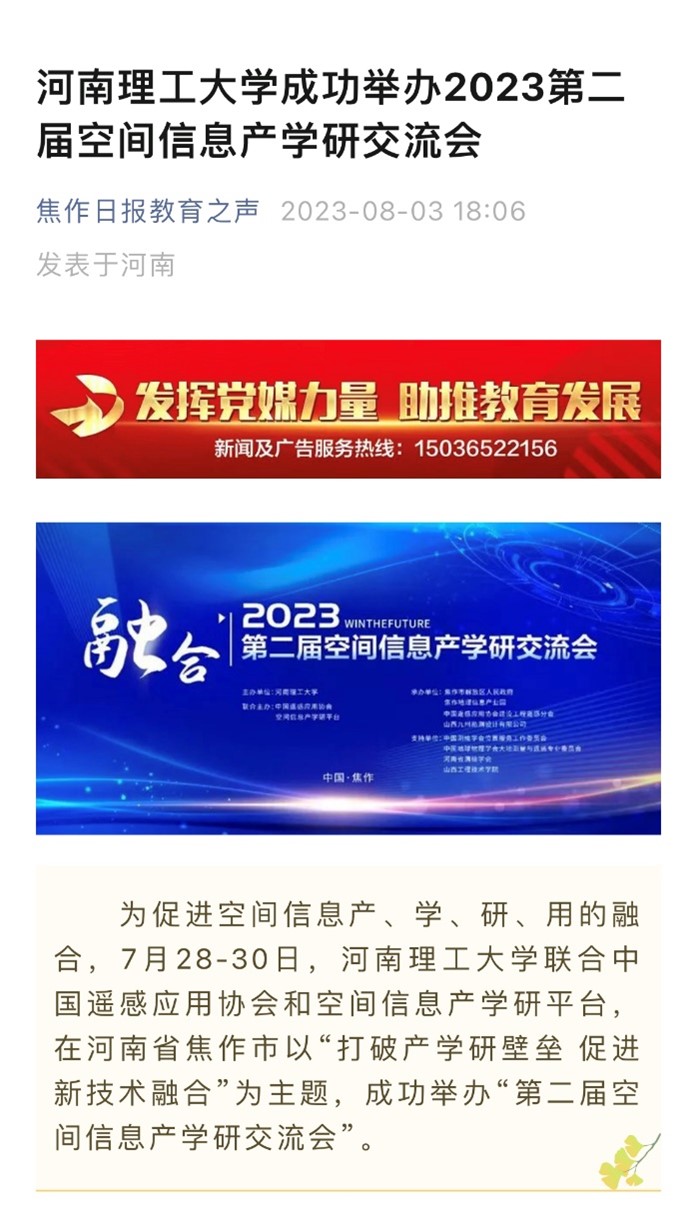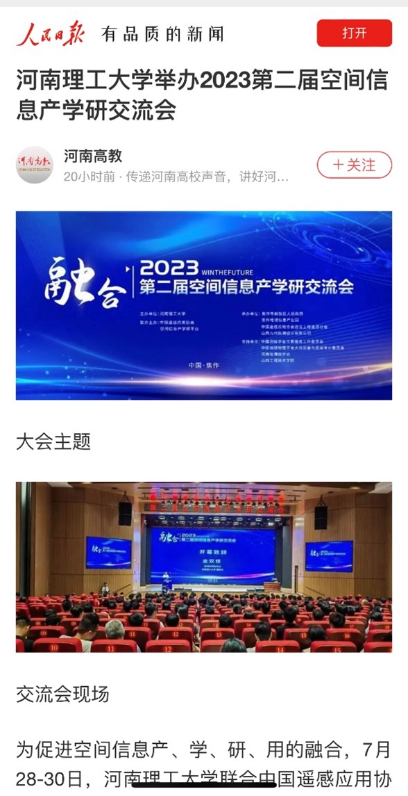8月3日,人民日报客户端(河南高教)以《河南理工大学举办2023第二届空间信息产学研交流会》为题并配发图片,报道学校联合中国遥感应用协会和空间信息产学研平台,在河南省焦作市以“打破产学研壁垒 促进新技术融合”为主题,举办“第二届空间信息产学研交流会”。相关内容如下: