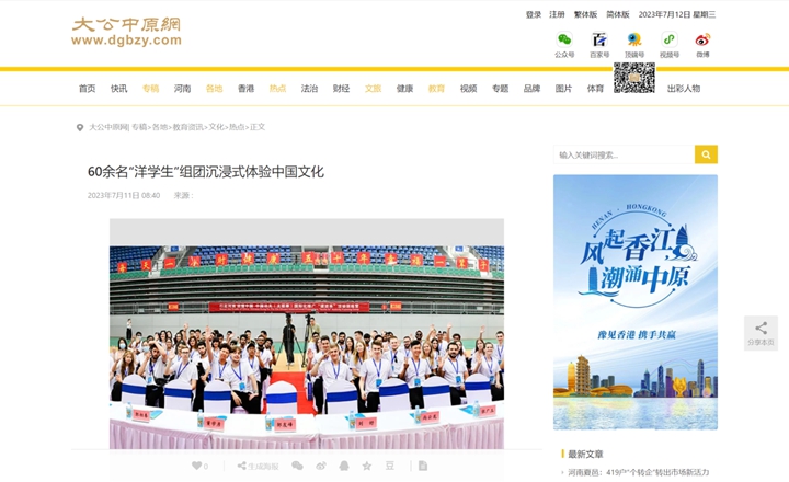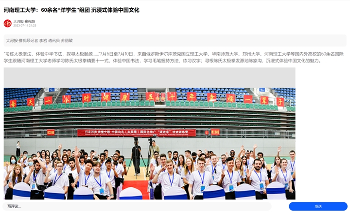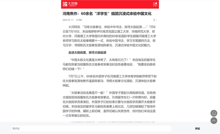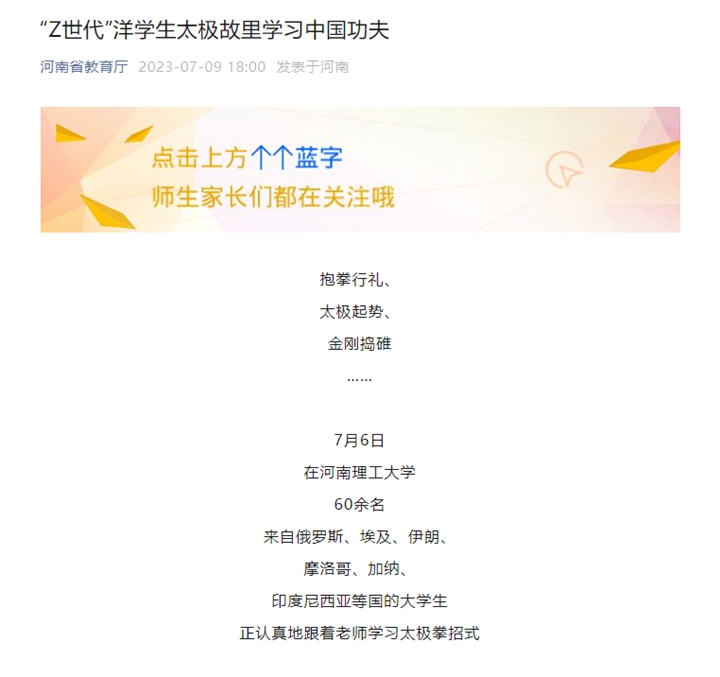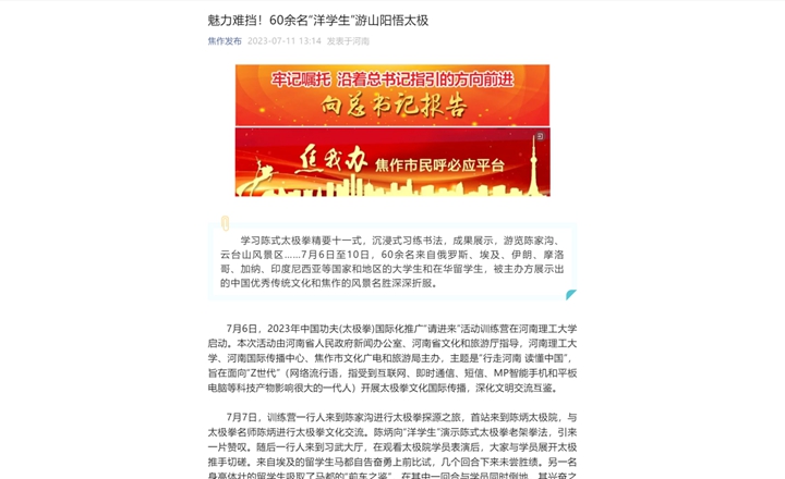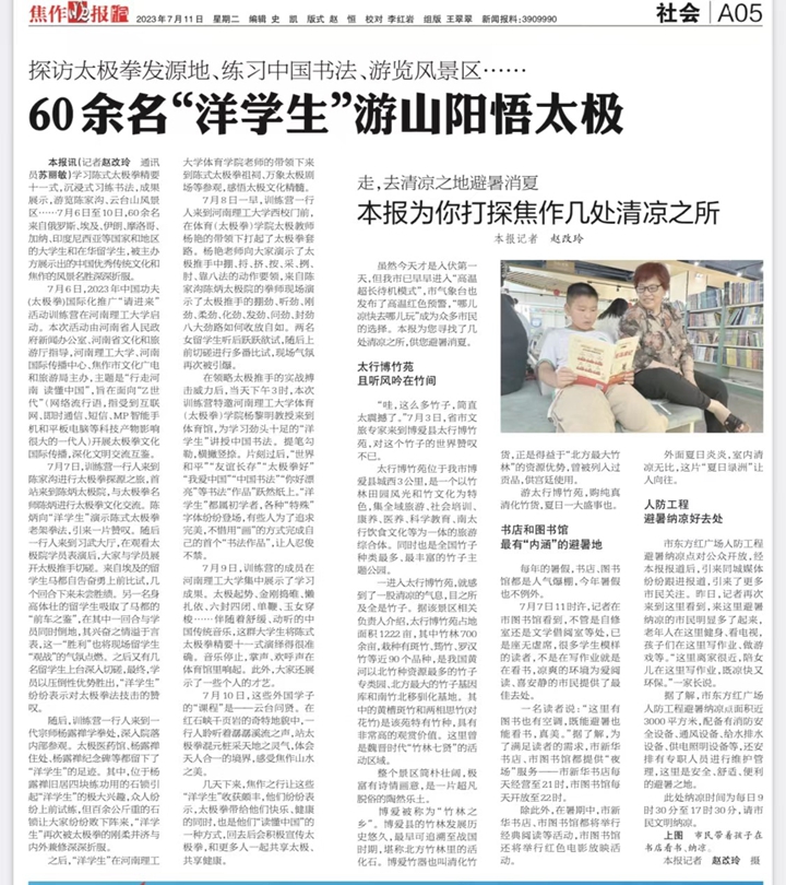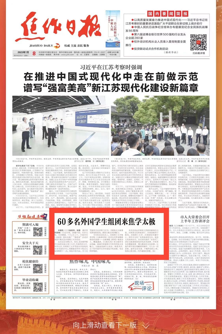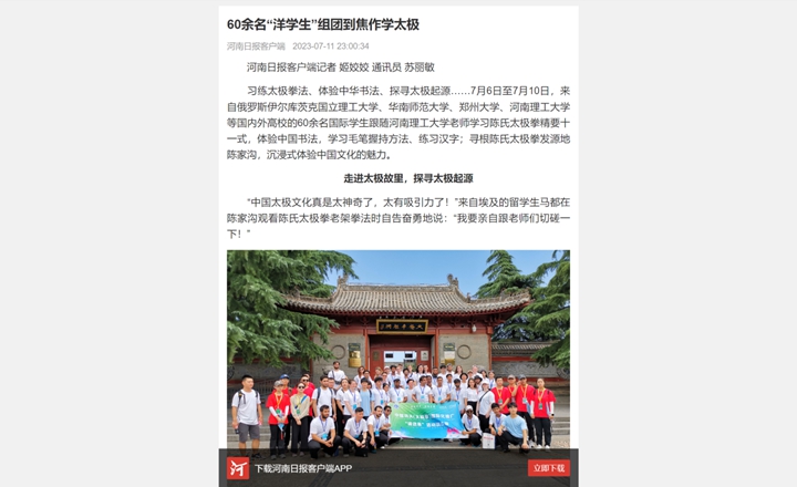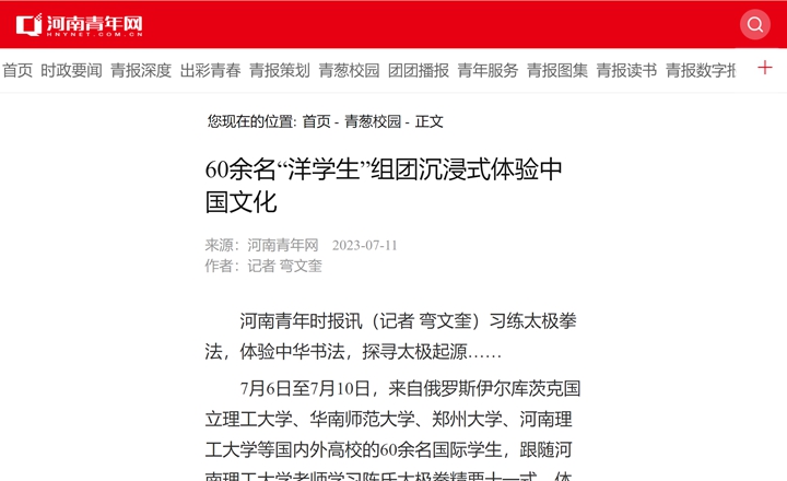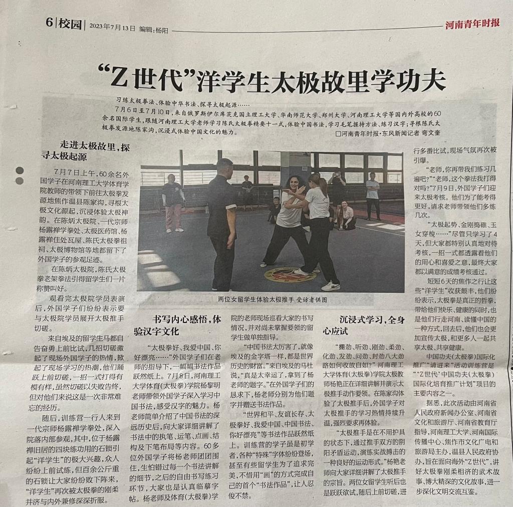 本网讯(记者 苏丽敏 通讯员 雷锦鹏)《河南青年报》第178期第6版2023年7月13日以《河南理工大学:60余名国际学生组团 沉浸式体验中国文化》为题并配发图片,报道来自国内外高校的60余名国际学生跟随河南理工大学老师学习陈氏太极拳精要十一式,体验中国书法,练习汉字;寻根陈氏太极拳发源地陈家沟的事件。河南日报客户端、河南青年网、大河网,以及国外媒体等也对此作了报道,相关内容如下: