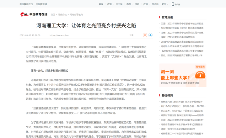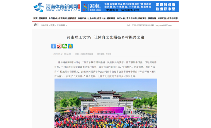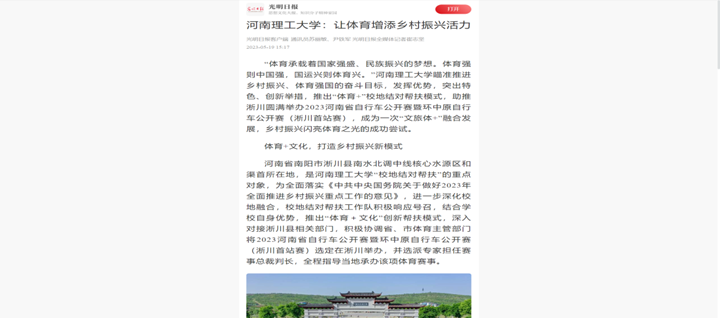 本网讯 (记者 苏丽敏 通讯员 尹铁军 雷锦鹏)光明日报客户端2023年5月25日以《河南理工大学:让体育增添乡村振兴活力》为题,报道学校瞄准推进乡村振兴、体育强国的奋斗目标,发挥优势,推出“体育+”校地结对帮扶模式,助推淅川圆满举办2023河南省自行车公开赛暨环中原自行车公开赛(淅川首站赛),成为一次“文旅体+”融合发展,乡村振兴闪亮体育之光的成功尝试。中国教育在线、河南日报客户端等媒体也对此作了报道,相关内容如下: