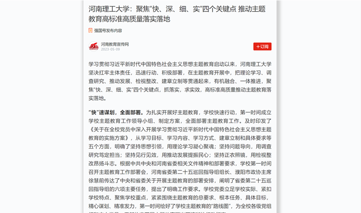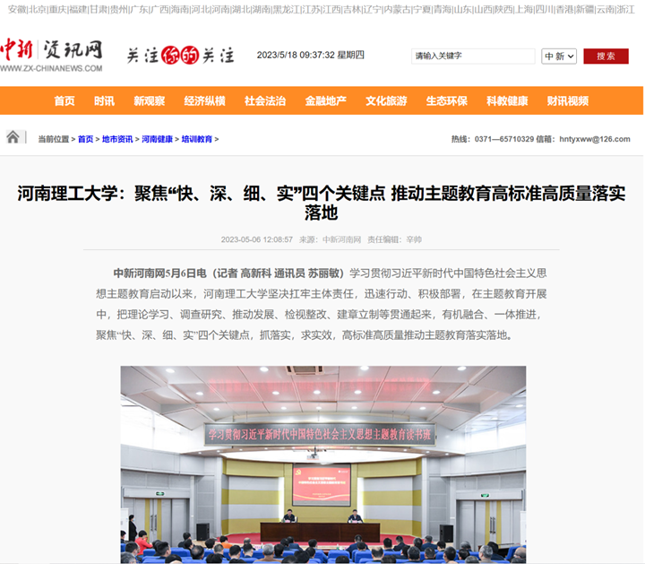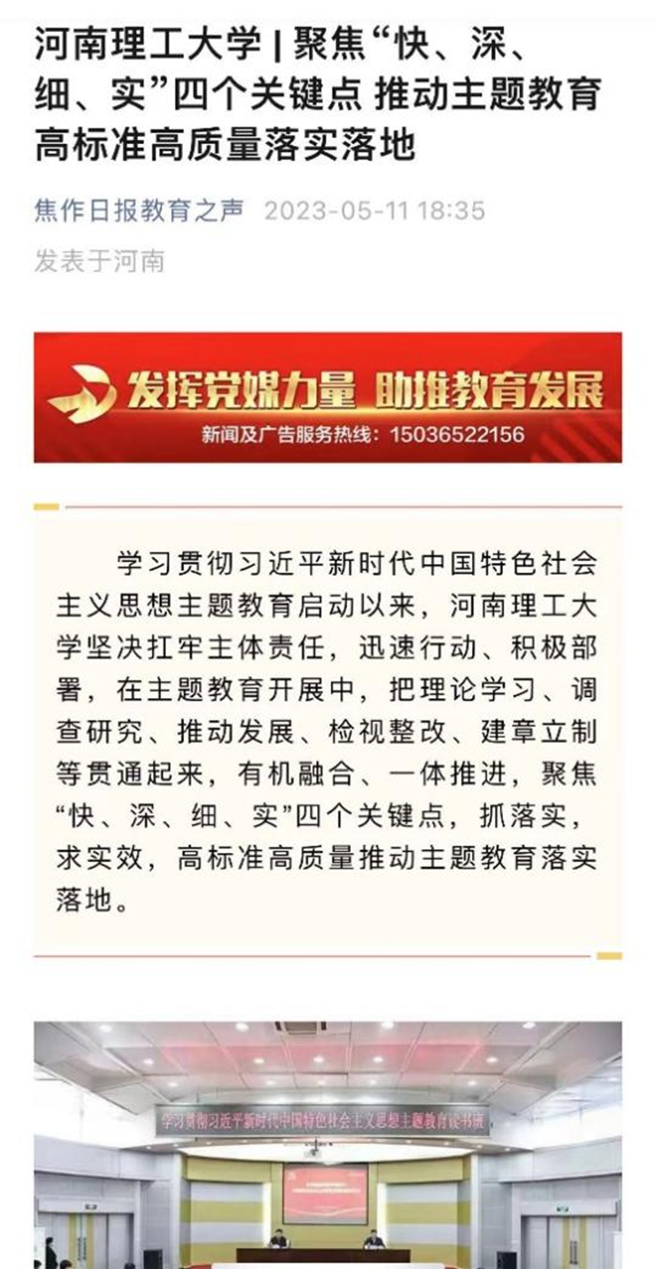 本网讯(记者 苏丽敏 通讯员 雷锦鹏)河南省教育厅官网2023年5月16日以《河南理工大学:聚焦“快、深、细、实”四个关键点 推动主题教育高标准高质量落实落地》为题,报道学校学习贯彻习近平新时代中国特色社会主义思想主题教育启动以来,聚焦“快、深、细、实”四个关键点,抓落实,求实效,高标准高质量推动主题教育落实落地的特色做法。中国周刊网、大河网、中新资讯网、河南教育宣传网等媒体也对此作了报道,相关内容如下: