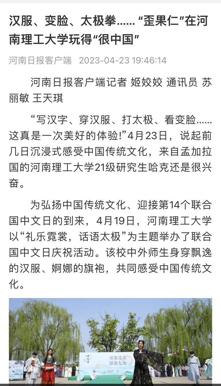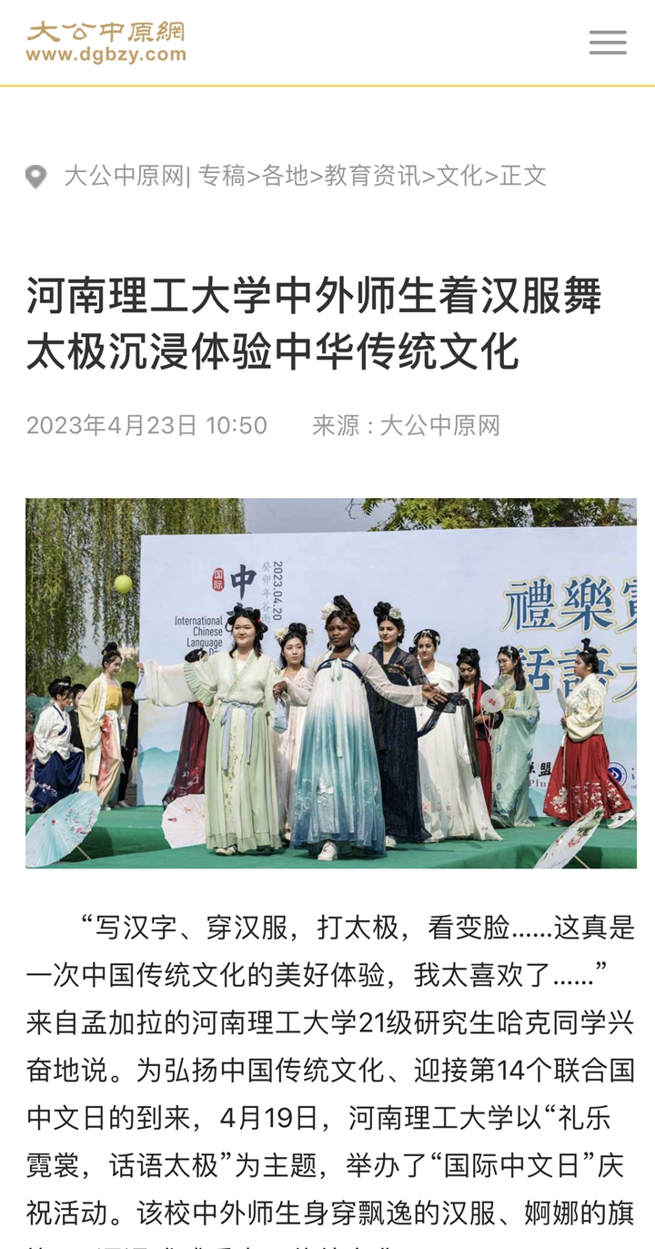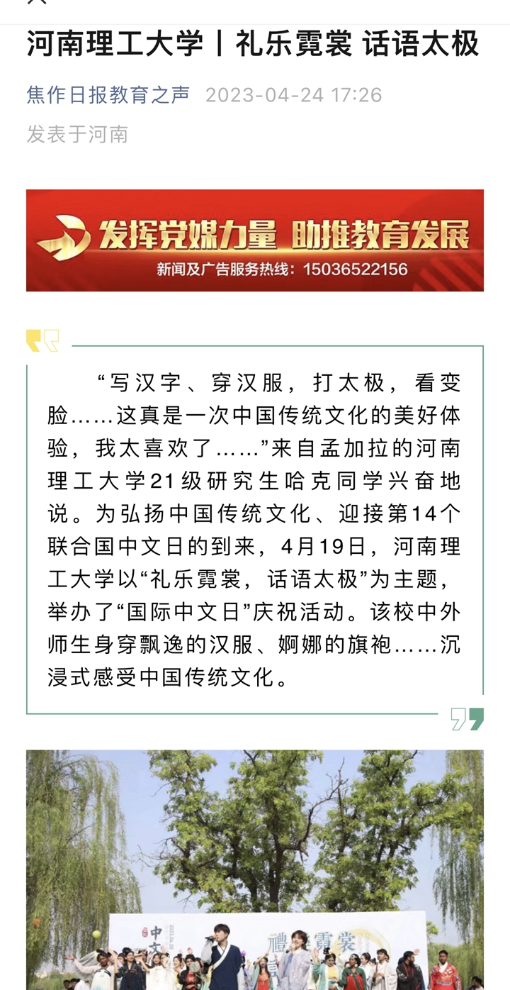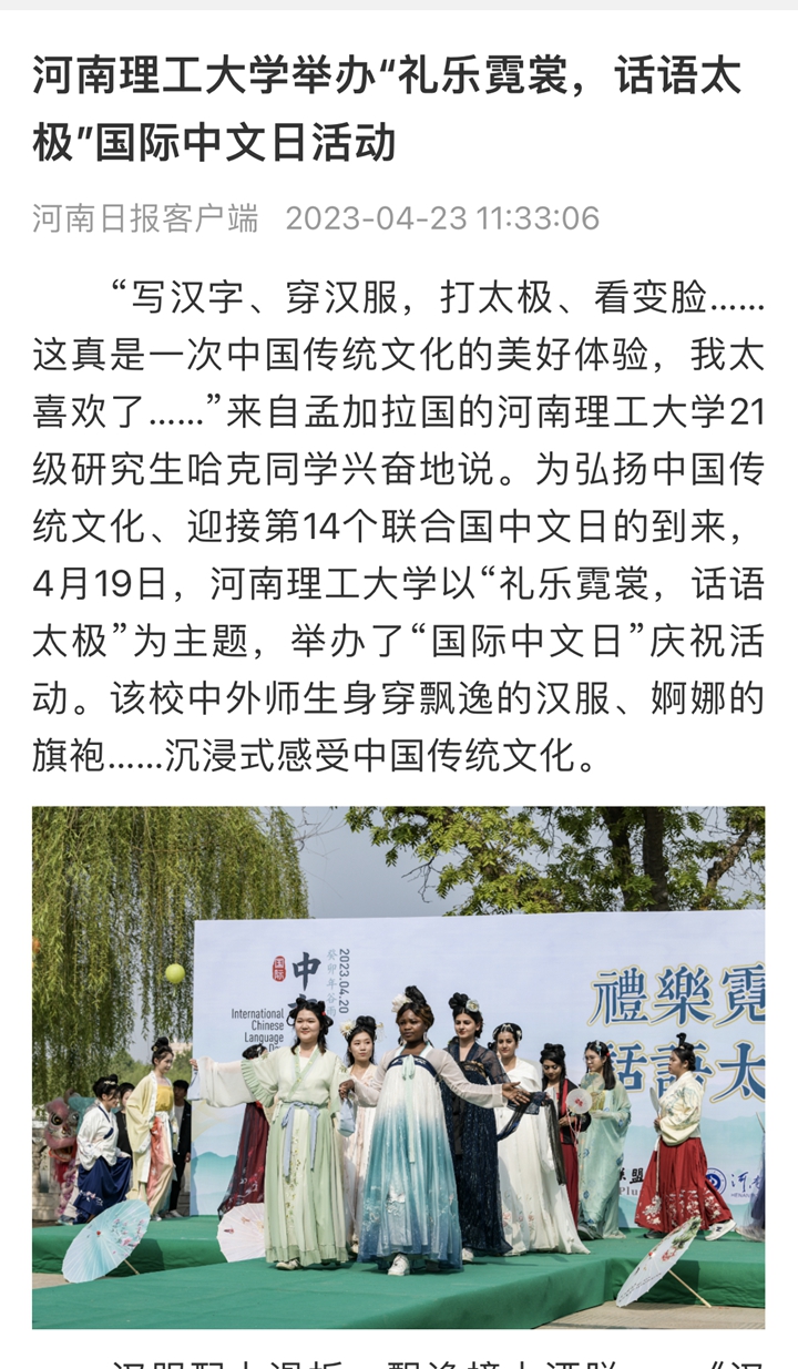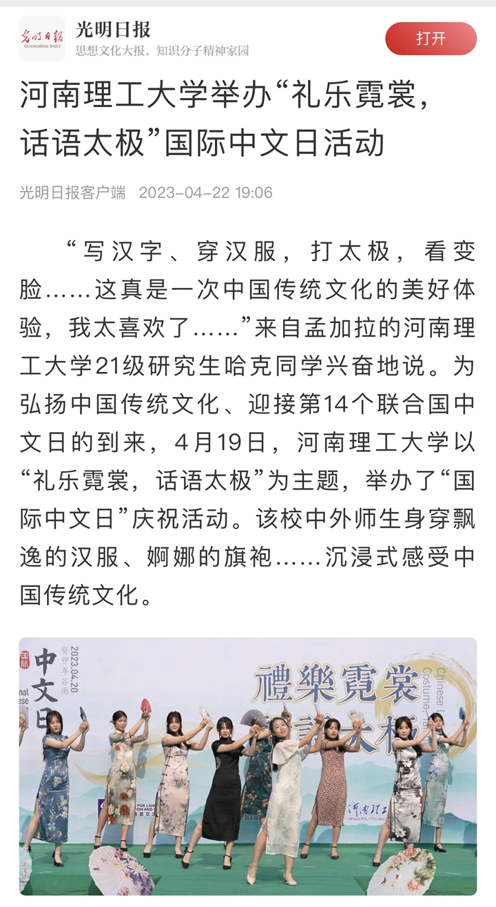 本网讯(记者 苏丽敏 通讯员 王天琪)光明日报客户端2023年4月22日以《河南理工大学举办“礼乐霓裳,话语太极”国际中文日活动》为题并配发图片,报道河南理工大学为迎接第14个联合国中文日的到来,以“礼乐霓裳,话语太极”为主题,举办了“国际中文日”庆祝活动。该校中外师生身穿飘逸的汉服、婀娜的旗袍……沉浸式感受中国传统文化。人民网、中国周刊网、河南日报客户端、大河报客户端等媒体也对此作了报道,相关内容如下: