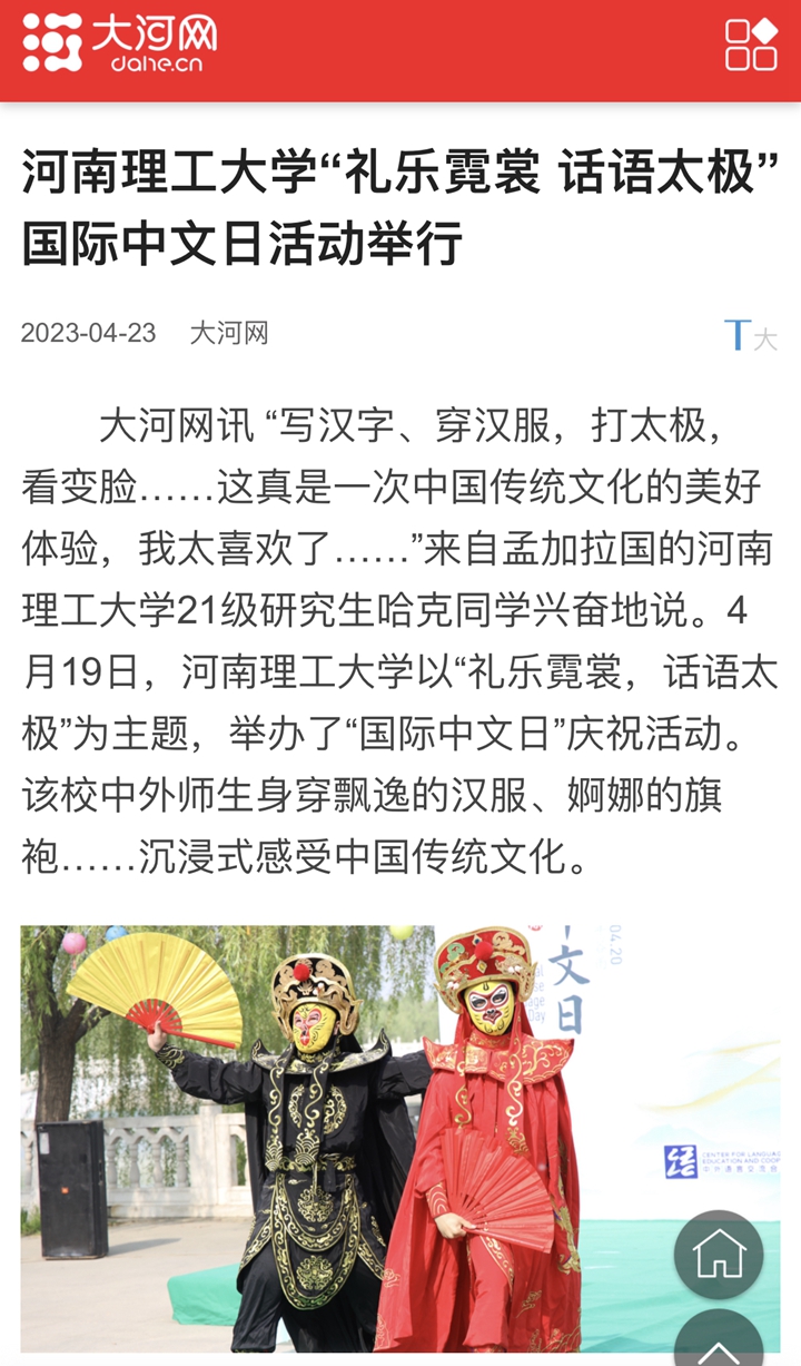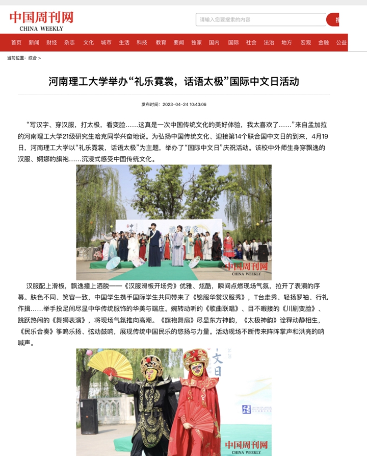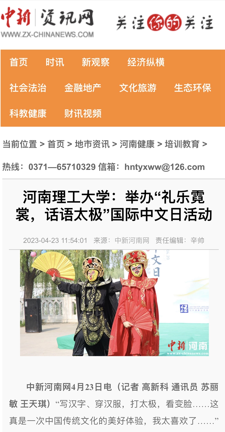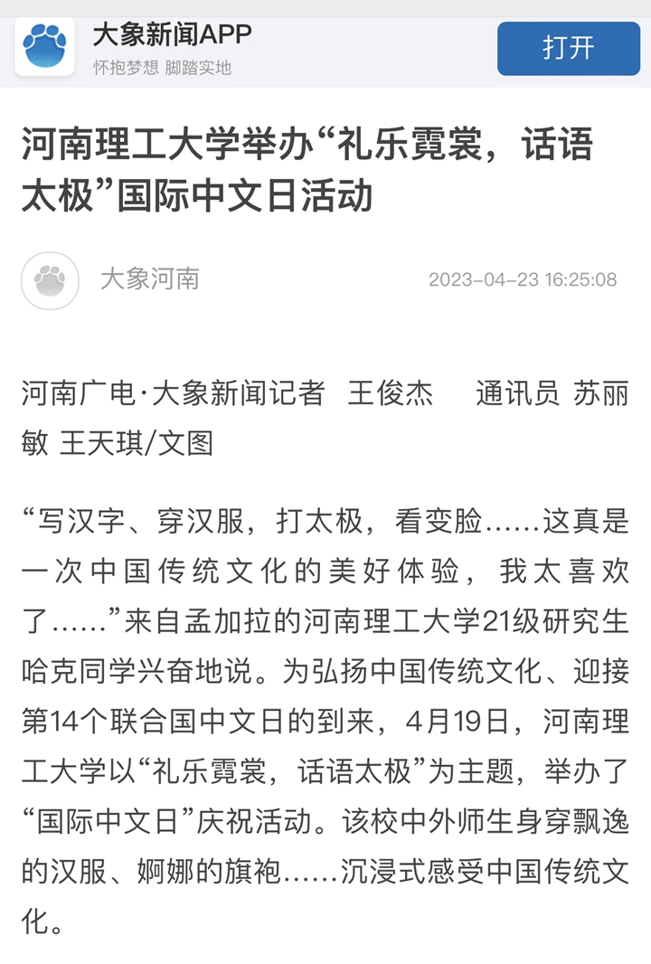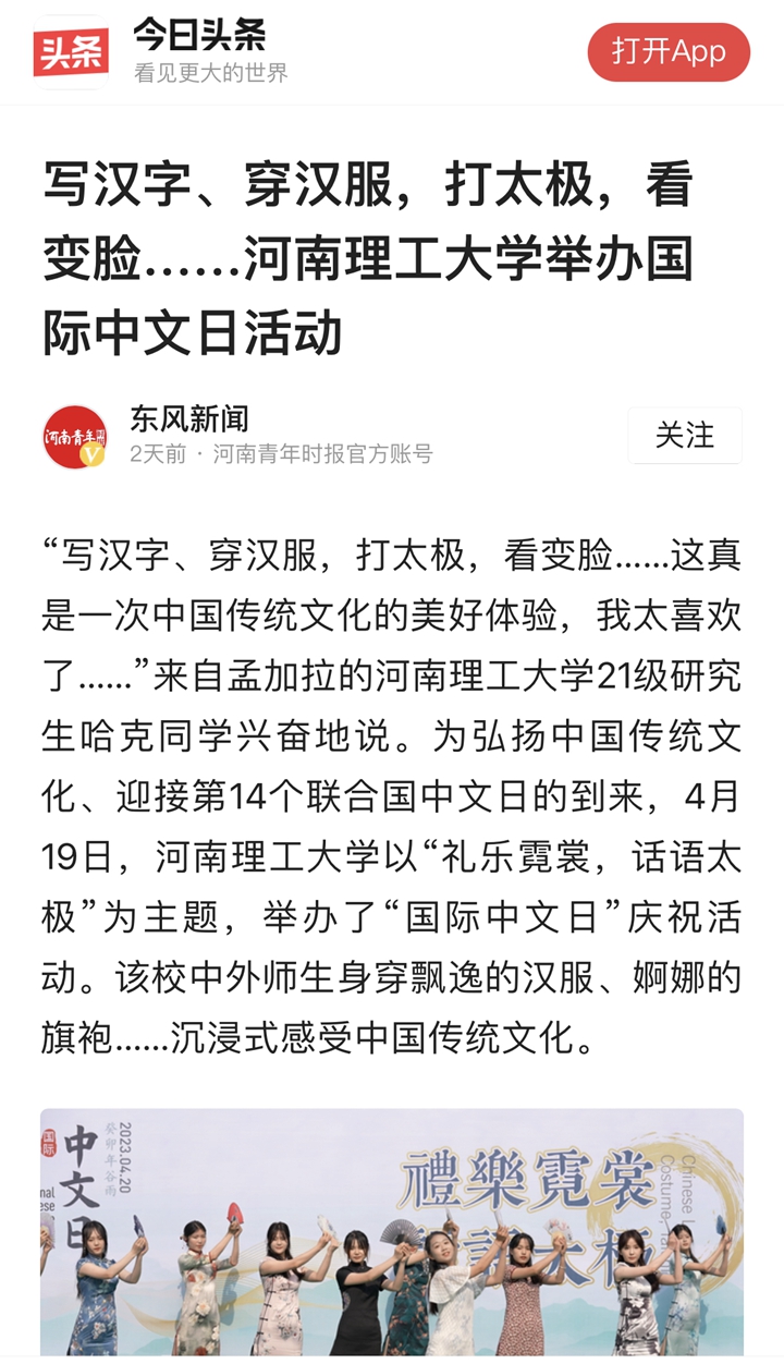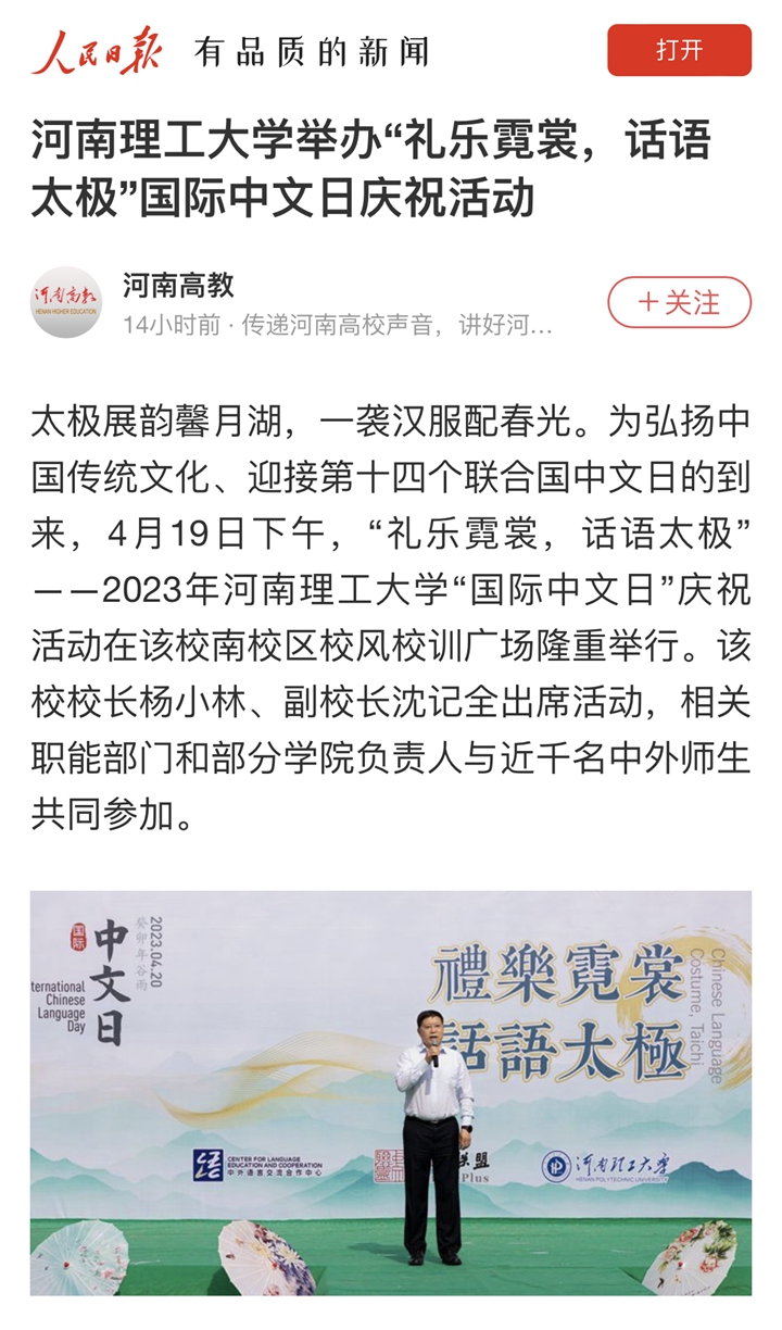 本网讯(记者 苏丽敏 通讯员 王天琪)光明日报客户端2023年4月22日以《河南理工大学举办“礼乐霓裳,话语太极”国际中文日活动》为题并配发图片,报道河南理工大学为迎接第14个联合国中文日的到来,以“礼乐霓裳,话语太极”为主题,举办了“国际中文日”庆祝活动。该校中外师生身穿飘逸的汉服、婀娜的旗袍……沉浸式感受中国传统文化。人民网、中国周刊网、河南日报客户端、大河报客户端等媒体也对此作了报道,相关内容如下: