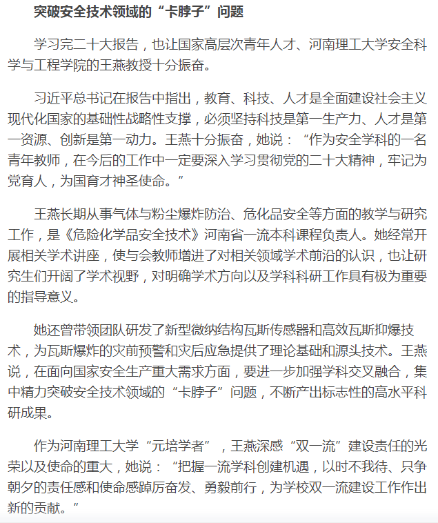 “党的二十大报告中,习近平总书记强调,教育、科技、人才是全面建设社会主义现代化国家的基础性、建设性支撑,科技是第一生产力,人才是第一资源,创新是第一动力。作为学科组的一名青年教师,我深感‘双一流’建设责任的光荣、使命的重大。”王燕说,在今后的工作中,要深入学习贯彻党的二十大报告精神,牢记为党育人、为国育才的神圣使命,以“时不我待、只争朝夕”的责任感和使命感,踔厉奋发,勇毅前行,带领团队不断向安全技术研究领域高峰冲刺,产出标志性高水平科研成果,为我国实现高水平科技自立自强和学校“双一流”创建做出新的贡献,以实际行动和优异成绩献礼党的二十大的胜利召开。