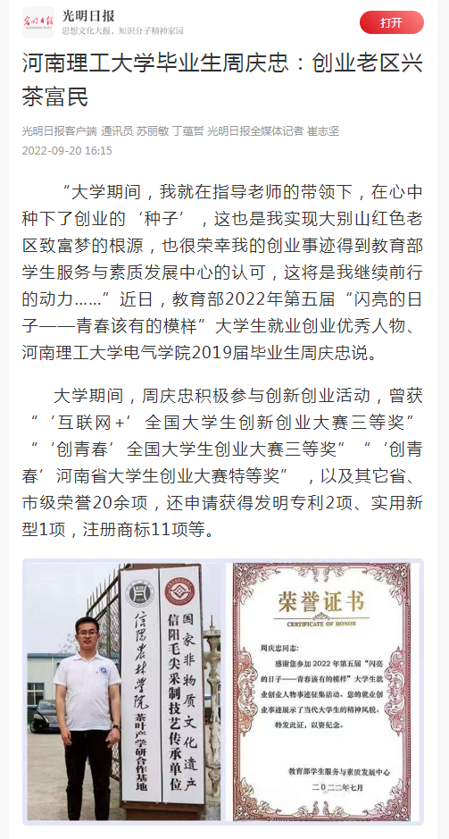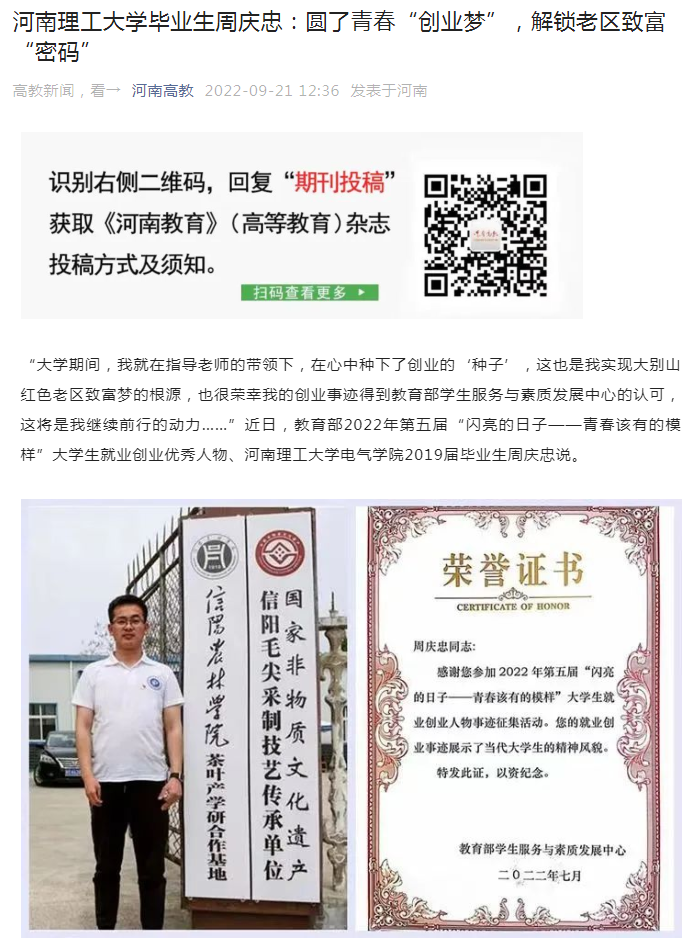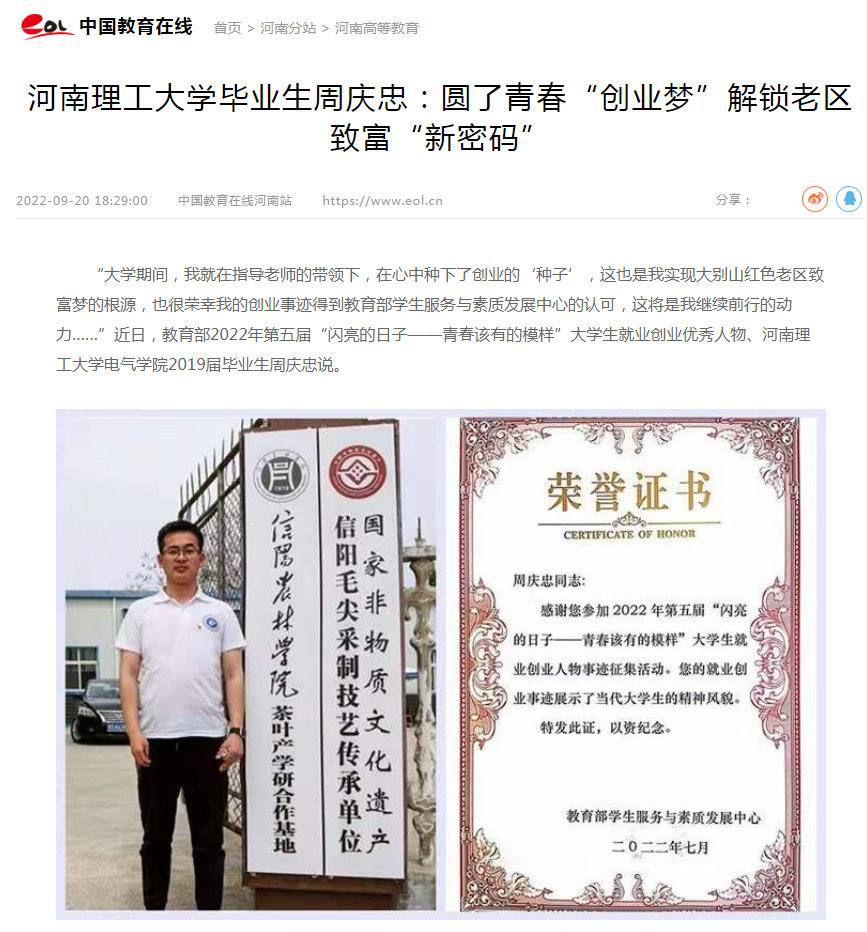 “大学期间,我就在指导老师的带领下,在心中种下了创业的‘种子’,这也是我实现大别山红色老区致富梦的根源,也很荣幸我的创业事迹得到教育部学生服务与素质发展中心的认可,这将是我继续前行的动力……”近日,教育部2022年第五届“闪亮的日子——青春该有的模样”大学生就业创业优秀人物、河南理工大学电气学院2019届毕业生周庆忠说。