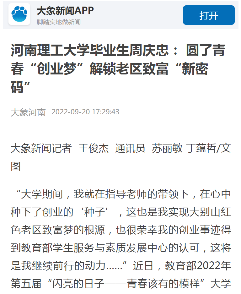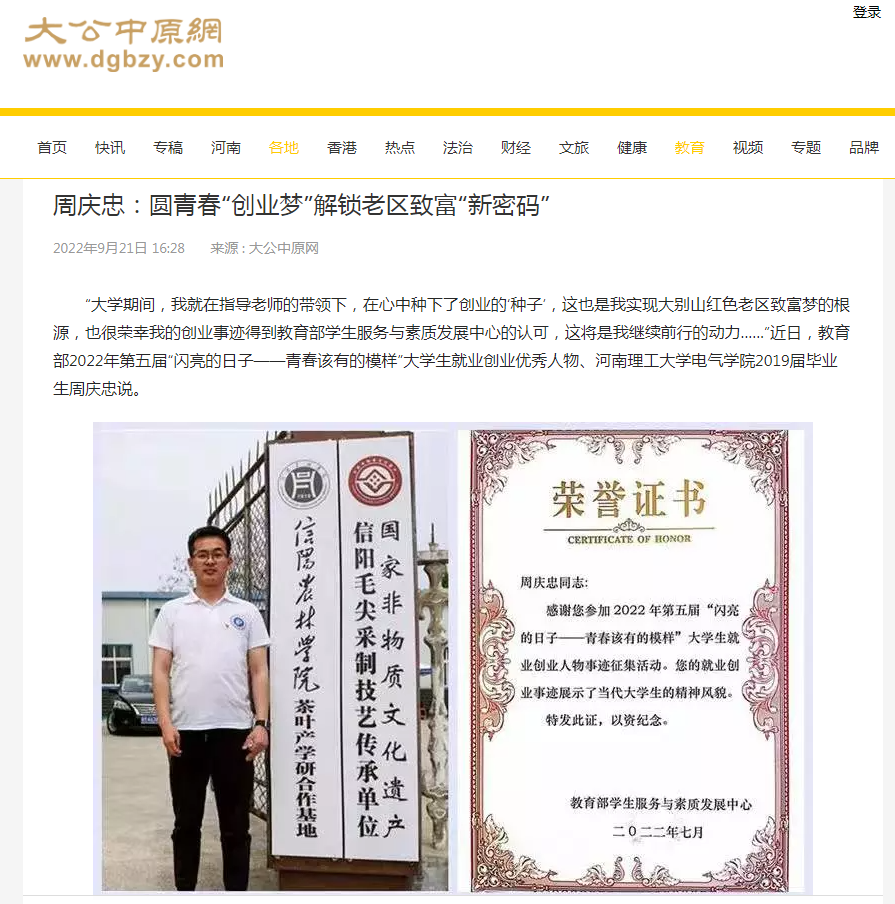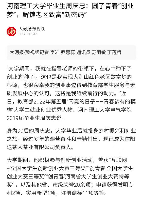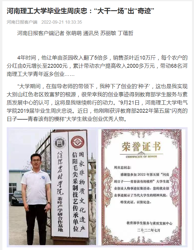 河南理工大学毕业生周庆忠:圆了青春“创业梦”解锁老区致富“新密码”