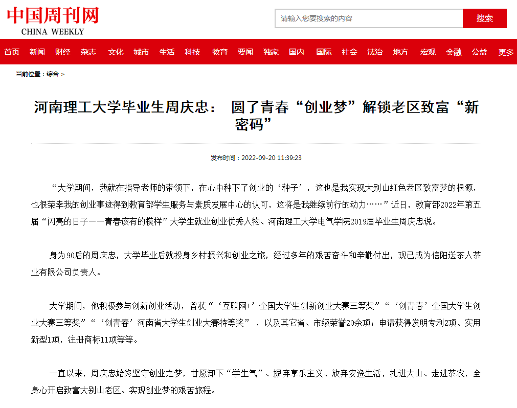 扎根革命老区兴茶富民,成就了青春创业梦想。周庆忠现已成为信阳送茶人茶业有限公司负责人。