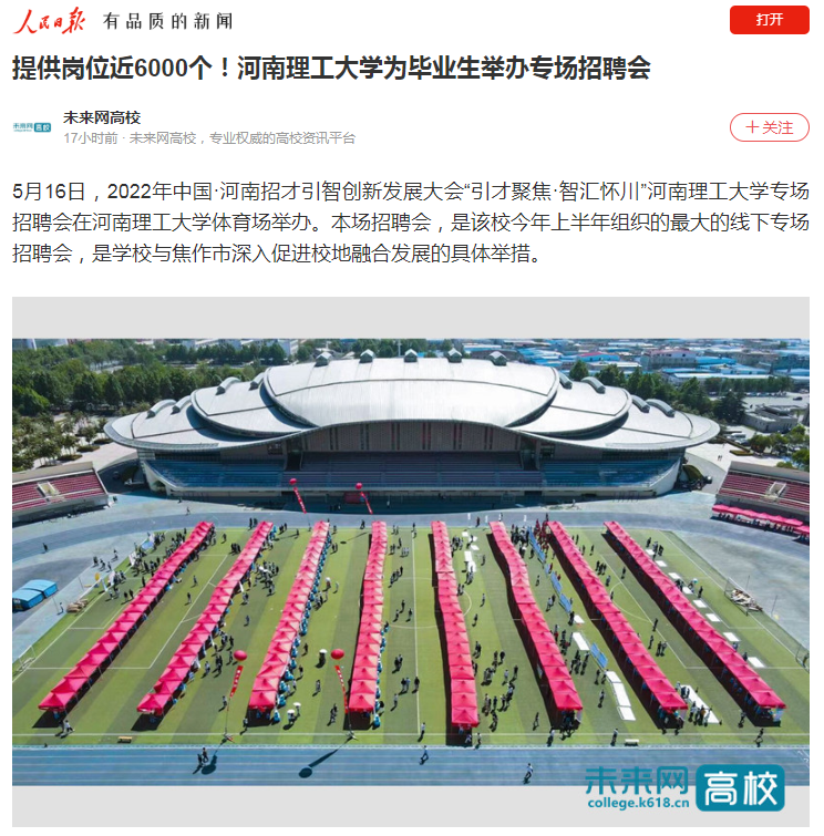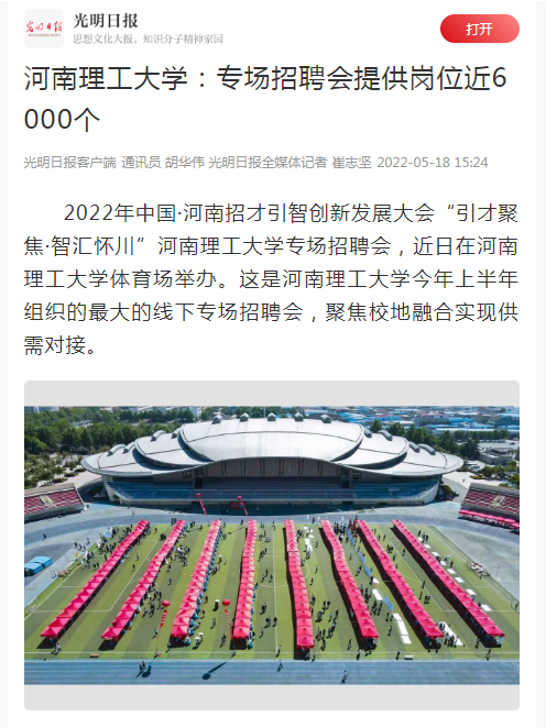 2022年中国·河南招才引智创新发展大会“引才聚焦·智汇怀川”河南理工大学专场招聘会,近日在河南理工大学体育场举办。这是河南理工大学今年上半年组织的最大的线下专场招聘会,聚焦校地融合实现供需对接。