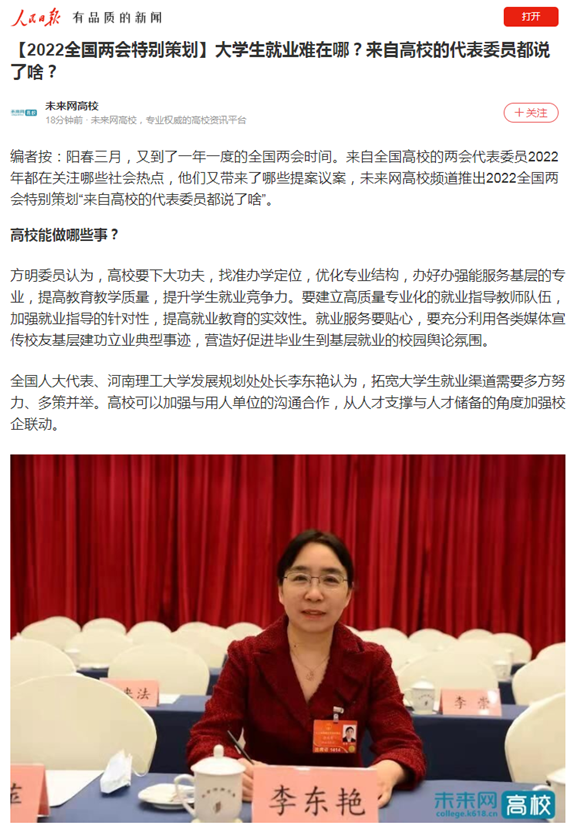 全国人大代表、河南理工大学发展规划处处长李东艳认为,拓宽大学生就业渠道需要多方努力、多策并举。高校可以加强与用人单位的沟通合作,从人才支撑与人才储备的角度加强校企联动。