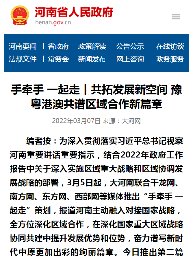 编者按:为深入贯彻落实习近平总书记视察河南重要讲话重要指示,结合2022年政府工作报告中关于深入实施区域重大战略和区域协调发展战略的部署,3月5日起,大河网联合千龙网、南方网、东方网、西部网等媒体推出“手牵手 一起走”策划,报道河南主动融入对接国家战略,全方位深化区域合作,在深化国家重大区域战略协同共建中提升发展优势和位势,奋力谱写新时代中原更加出彩的绚丽篇章。今日推出第二篇——《共拓发展新空间 豫粤港澳共谱区域合作新篇章》