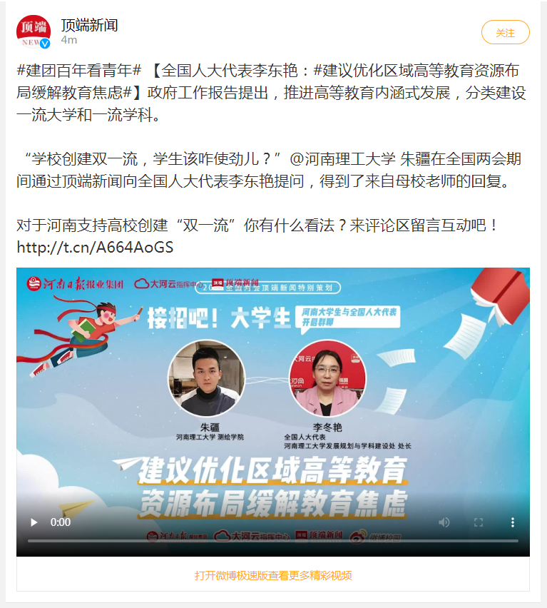 “学校创建双一流,学生该咋使劲儿?”@河南理工大学 朱疆在全国两会期间通过顶端新闻向全国人大代表李东艳提问,得到了来自母校老师的回复。