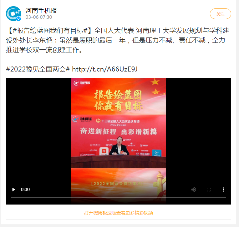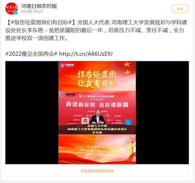 【#报告绘蓝图我们有目标#】全国人大代表 河南理工大学发展规划与学科建设处处长李东艳:虽然是履职的最后一年,但是压力不减、责任不减,全力推进学校双一流创建工作。#2022豫见全国两会# http://t.cn/A66UzE9J ???