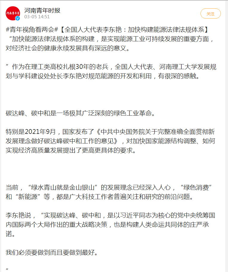 【#报告绘蓝图我们有目标#】全国人大代表 河南理工大学发展规划与学科建设处处长李东艳:虽然是履职的最后一年,但是压力不减、责任不减,全力推进学校双一流创建工作。#2022豫见全国两会# http://t.cn/A66UzE9J ?