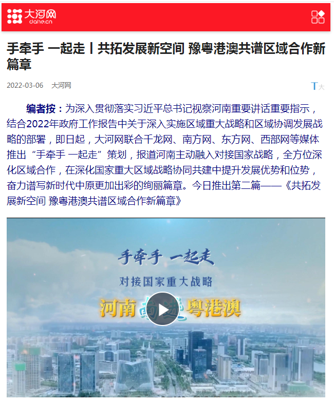 编者按:为深入贯彻落实习近平总书记视察河南重要讲话重要指示,结合2022年政府工作报告中关于深入实施区域重大战略和区域协调发展战略的部署,即日起,大河网联合千龙网、南方网、东方网、西部网等媒体推出“手牵手 一起走”策划,报道河南主动融入对接国家战略,全方位深化区域合作,在深化国家重大区域战略协同共建中提升发展优势和位势,奋力谱写新时代中原更加出彩的绚丽篇章。今日推出第二篇——《共拓发展新空间 豫粤港澳共谱区域合作新篇章》。