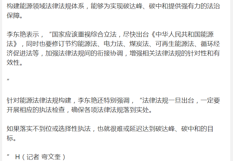 针对能源法律法规构建,李东艳还特别强调,“法律法规一旦出台,一定要开展相应的执法检查,确保各项法律法规落到实处。如果落实不到位或选择性执法,也就很难或延迟达到碳达峰、碳中和的目标。”