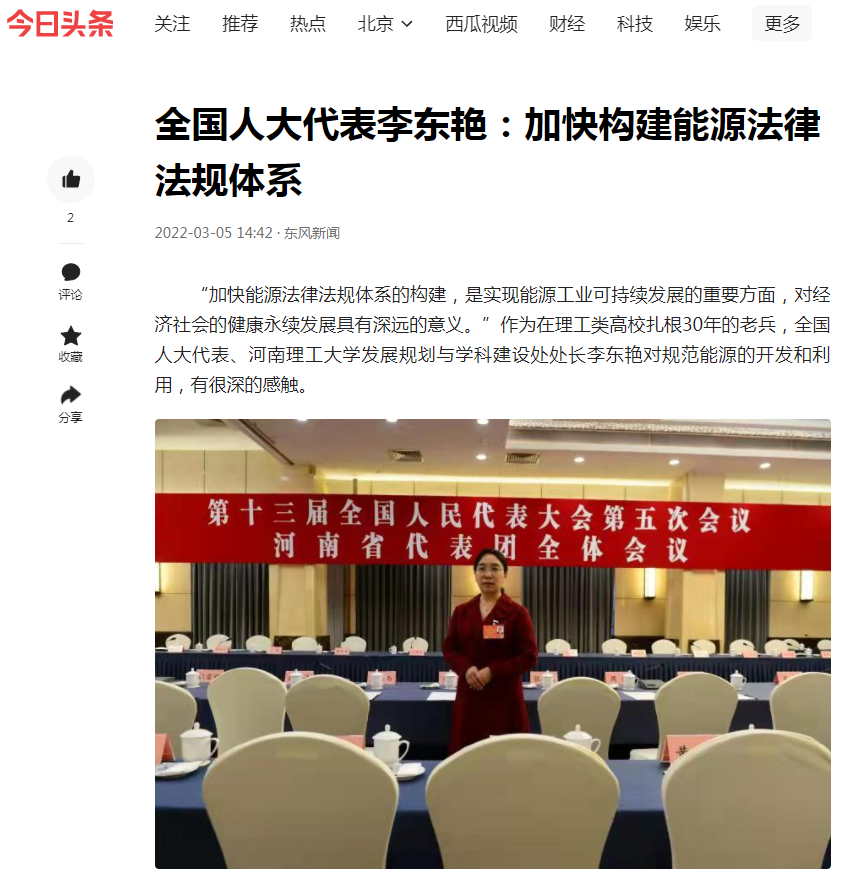 “加快能源法律法规体系的构建,是实现能源工业可持续发展的重要方面,对经济社会的健康永续发展具有深远的意义。”作为在理工类高校扎根30年的老兵,全国人大代表、河南理工大学发展规划与学科建设处处长李东艳对规范能源的开发和利用,有很深的感触。