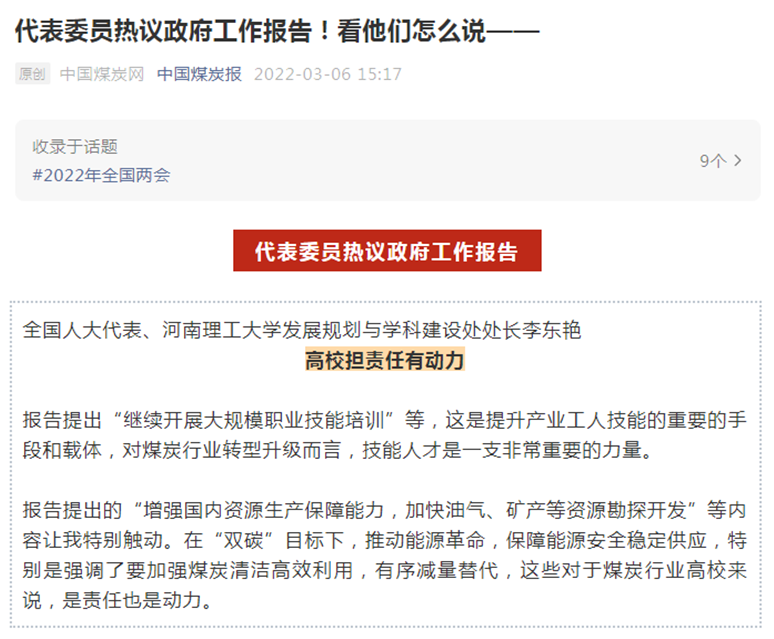 报告提出的“增强国内资源生产保障能力,加快油气、矿产等资源勘探开发”等内容让我特别触动。在“双碳”目标下,推动能源革命,保障能源安全稳定供应,特别是强调了要加强煤炭清洁高效利用,有序减量替代,这些对于煤炭行业高校来说,是责任也是动力。