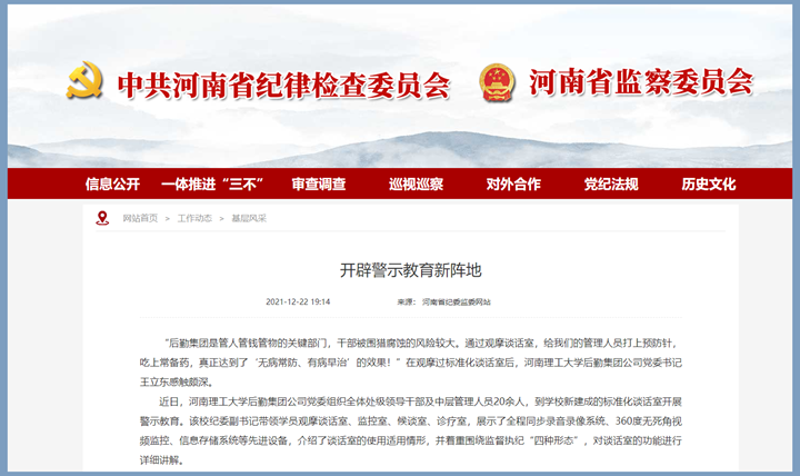 “后勤集团是管人管钱管物的关键部门,干部被围猎腐蚀的风险较大。通过观摩谈话室,给我们的管理人员打上预防针,吃上常备药,真正达到了‘无病常防、有病早治’的效果!”在观摩过标准化谈话室后,河南理工大学后勤集团公司党委书记王立东感触颇深。